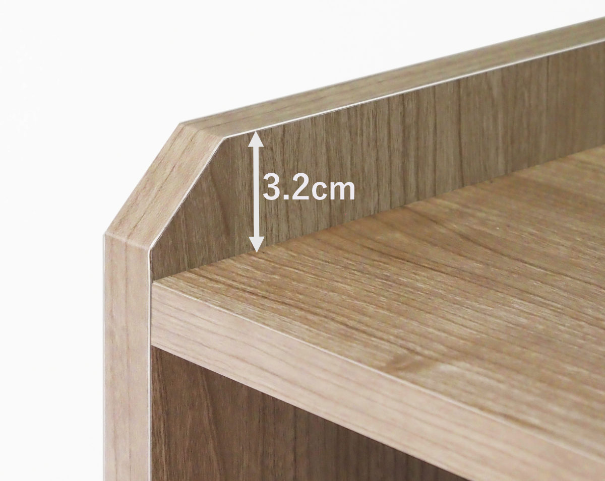 側板よりも天板を3.2cm低くし、さらに側板のコーナー部分をカットすることで、天板上のディスプレイをしっかりと惹き立てます。フチの立ち上がりは置いた物の落下防止の役割も。