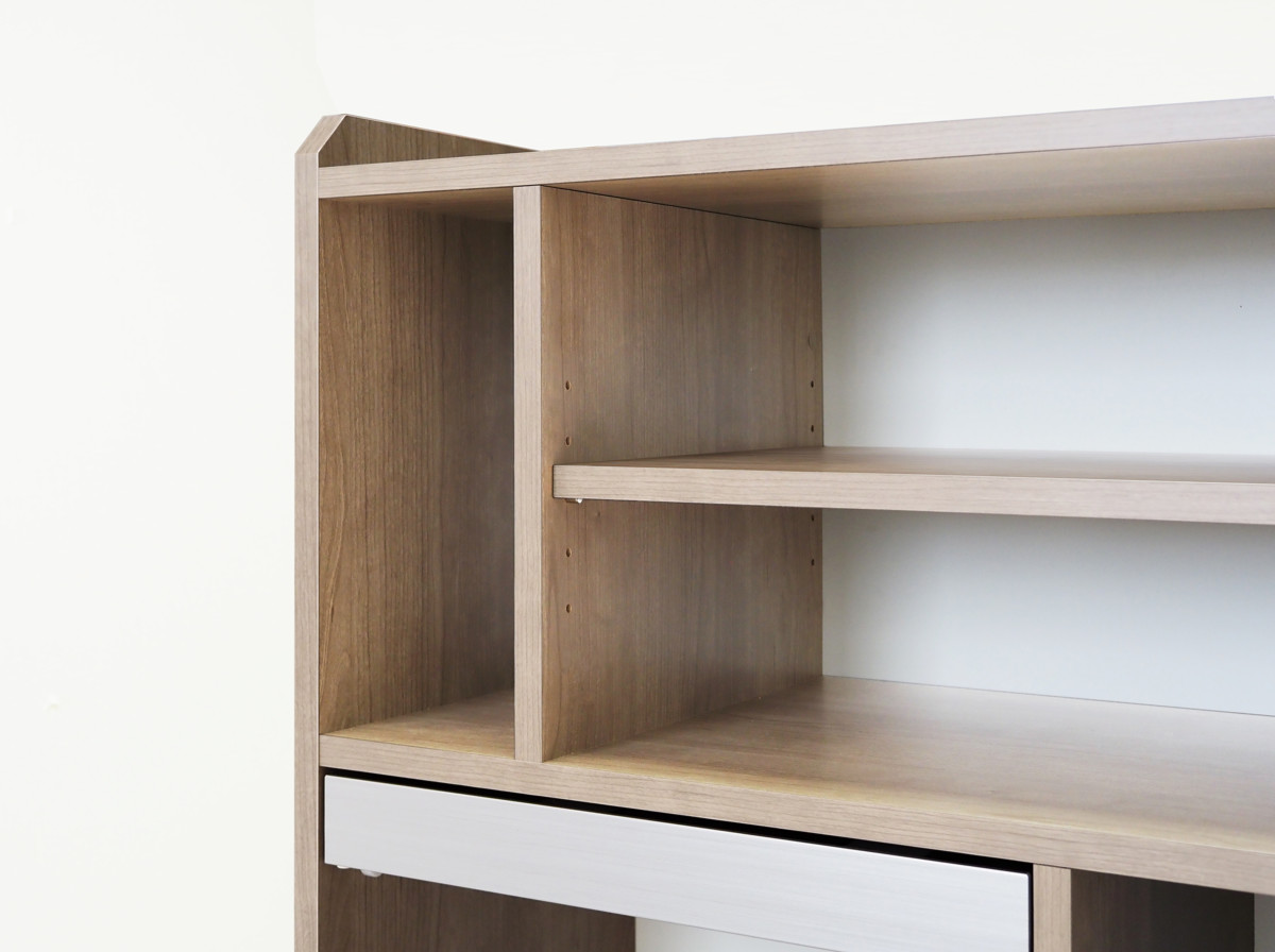 側板よりも天板を3.2cm低くし、さらに側板のコーナー部分をカットすることで、天板上のディスプレイをしっかりと惹き立てます。フチの立ち上がりは置いた物の落下防止の役割も。