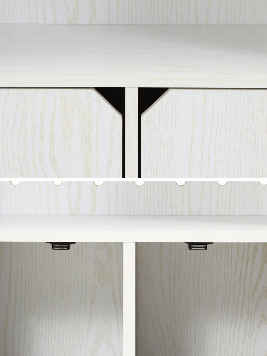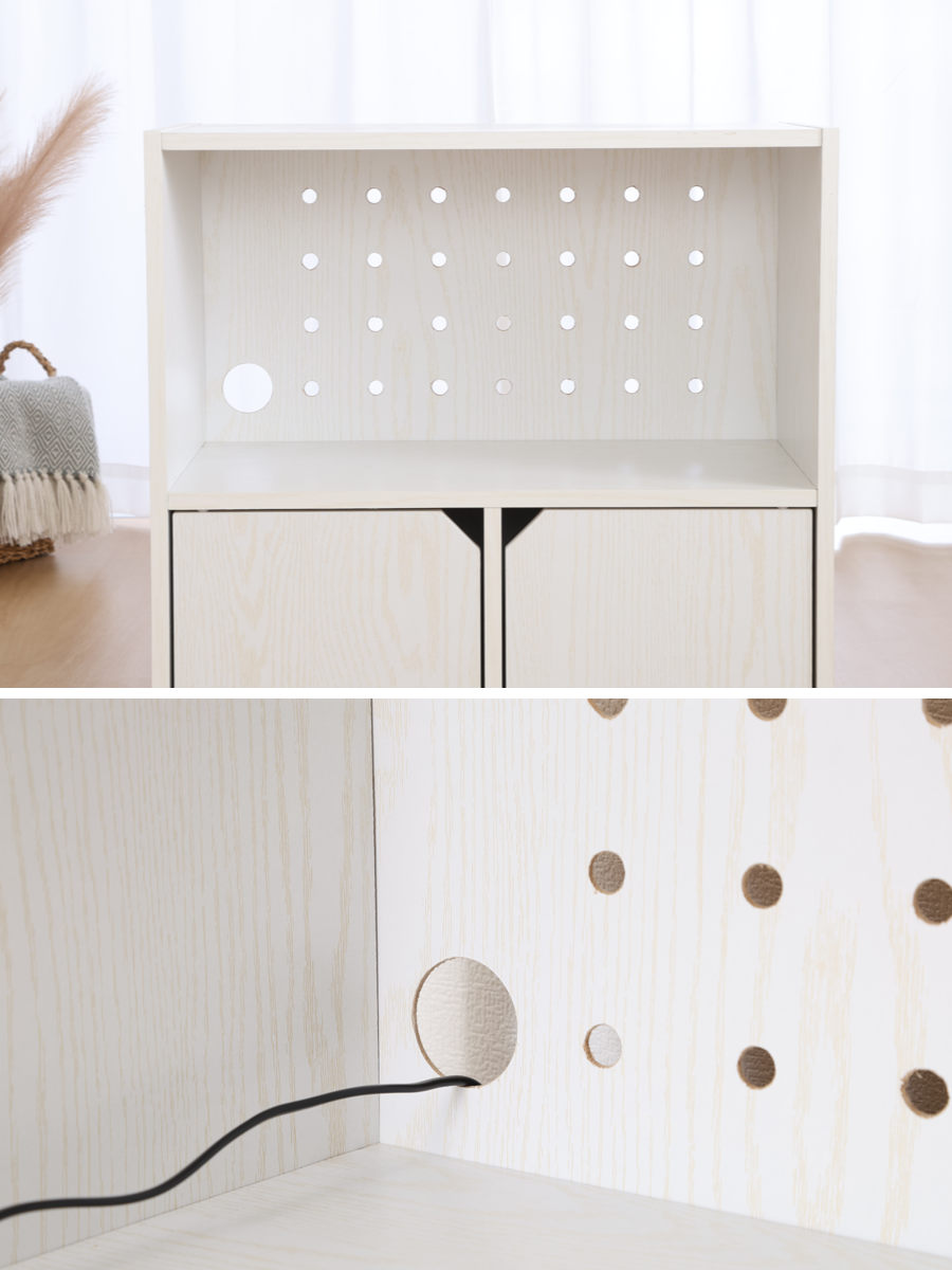 背板には、配線穴とパンチング加工が施されています。電子機器の配線が楽にでき、熱がこもることを防止するので、AV機器などの設置が可能です。