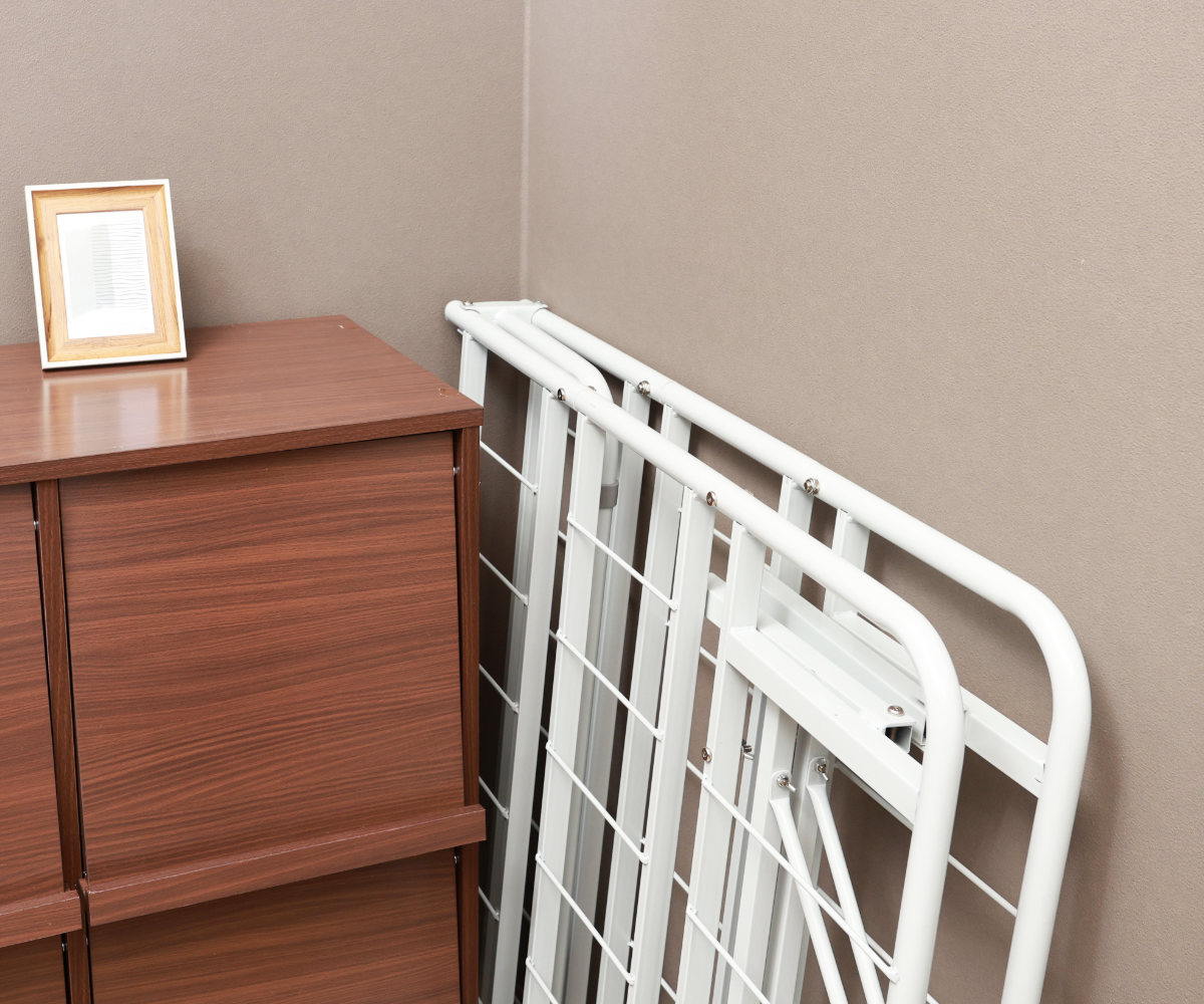 折りたたむと奥行約12cmとコンパクトサイズなので持ち運びも楽々です。お掃除の際や床面を広く使いたい時など、壁に立て掛けておいたり、ちょっとしたすき間に収納できます。