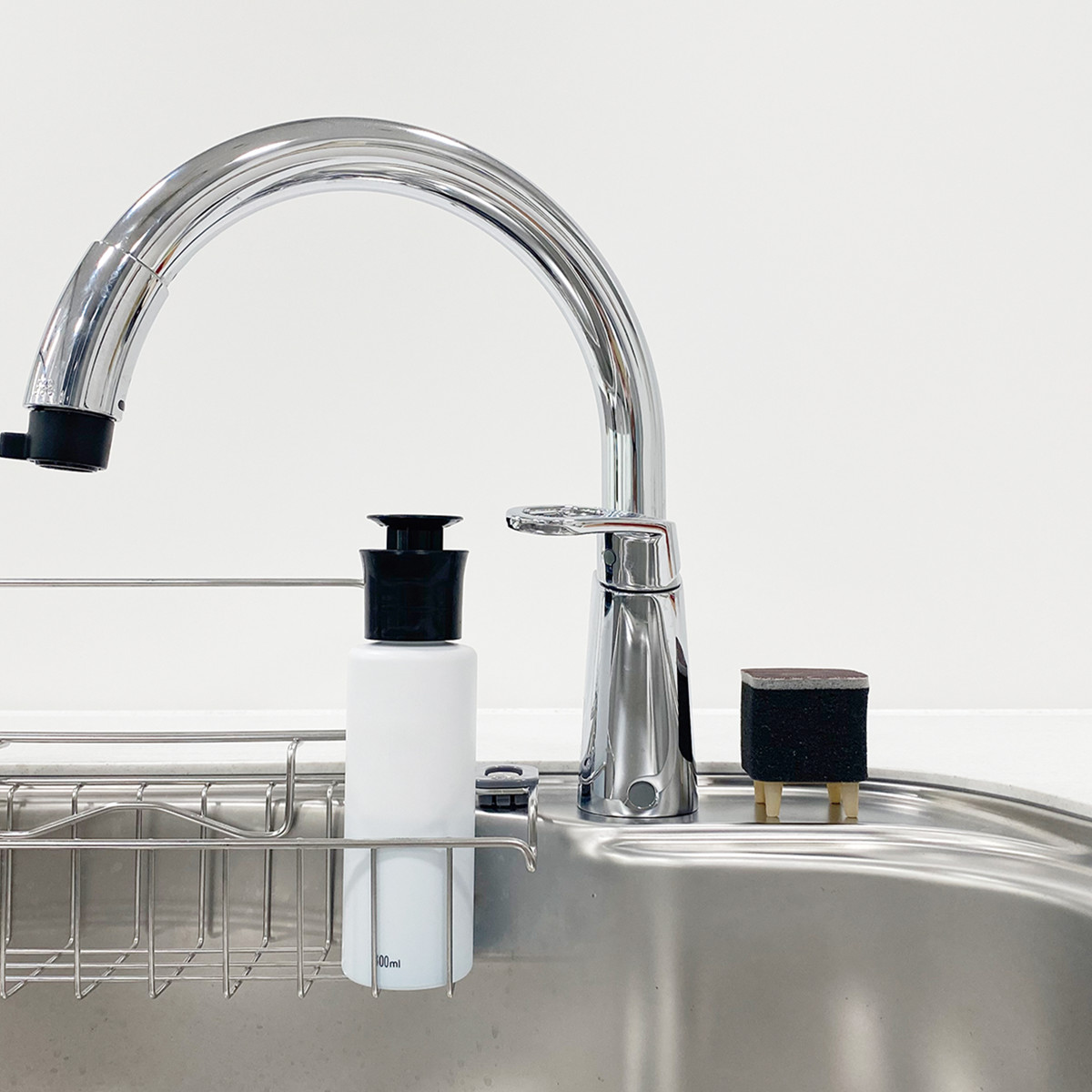 キューブの下に4本の脚があり、ちょこんと置くと自立します。立てて置くと通気性がよく、衛生的に保管できます。何より、立ち姿がユーモラスで、キッチンや洗面台などに置きたくなるデザインです。汚れに気づいたらサッと取って掃除できます。