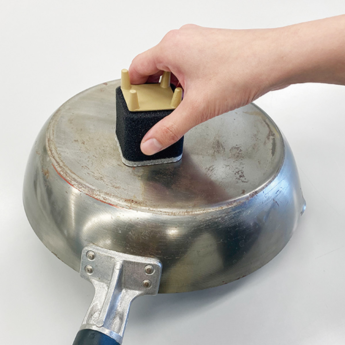 スポンジのトップにメッシュ状の研磨材が付いており、固まったガンコ汚れや鍋のコゲなどを削って落とします。