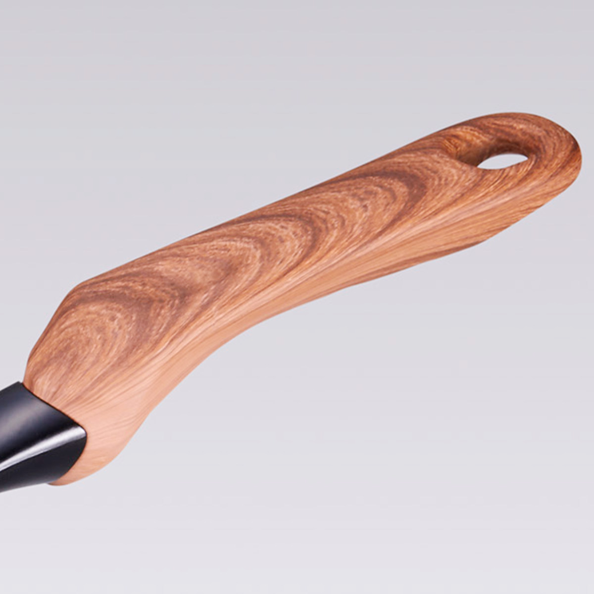 握りやすく、すべりにくい木目調のハンドルはシリコン製なのでしっとり手に馴染みます。親指が当たる部分は凹みがあり濡れた手でもしっかり持つことができます。