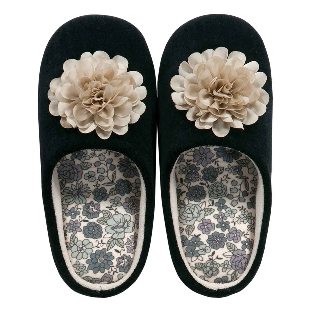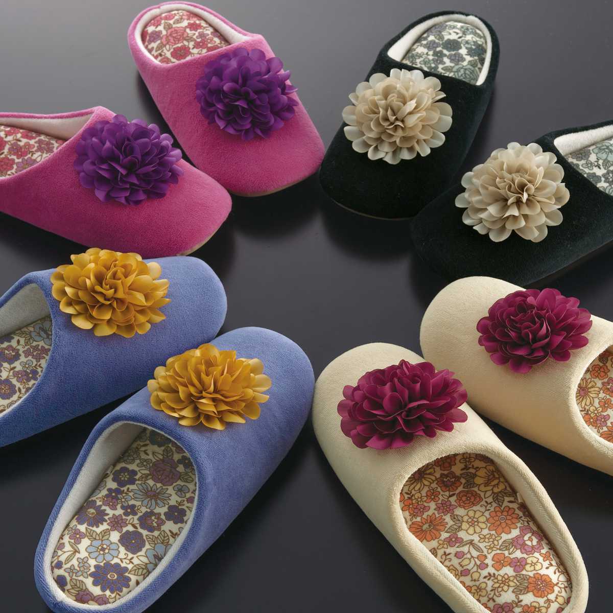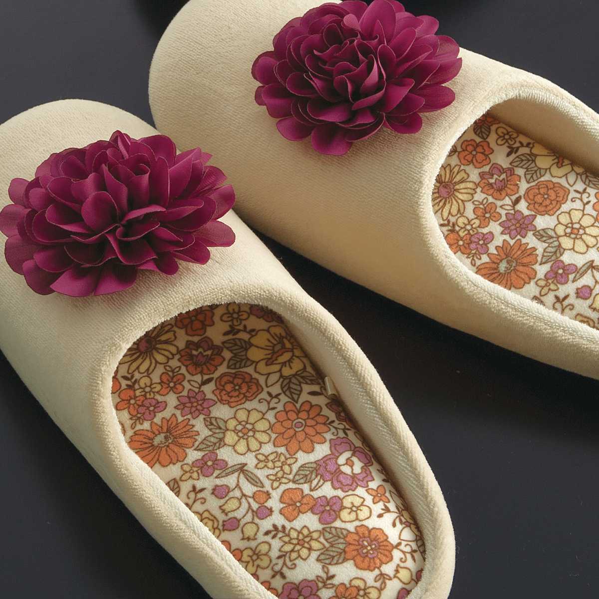 大きな花のモチーフと、リバティ風の小花柄がかわいいリビングスリッパ。お部屋にそっと華やぎを添えてくれる素敵なデザインです。丸洗いができるので、汚れても気軽にお洗濯ができ、いつも清潔にお使いいただけます。
