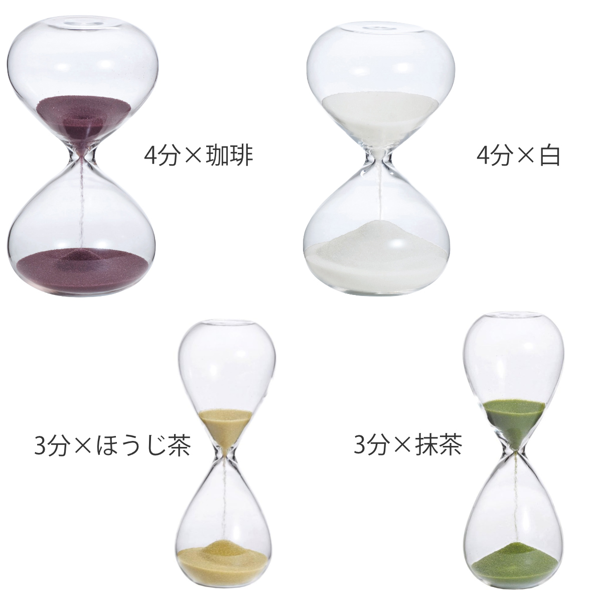 ほうじ茶・抹茶は約3分、珈琲・白は約4分、藤・桃・黄は約5分計測できます。