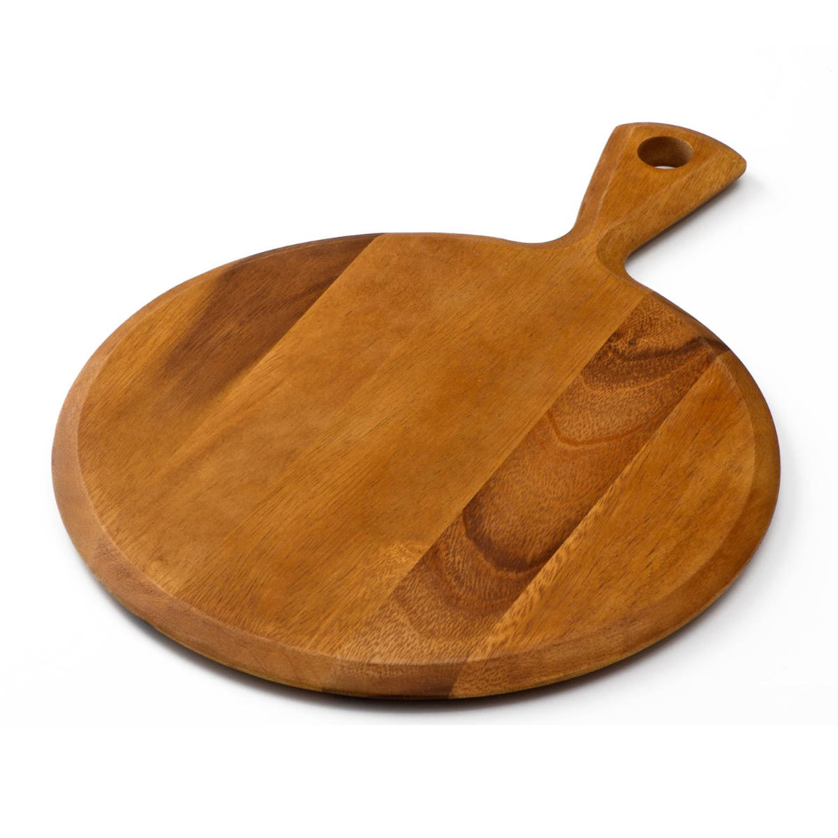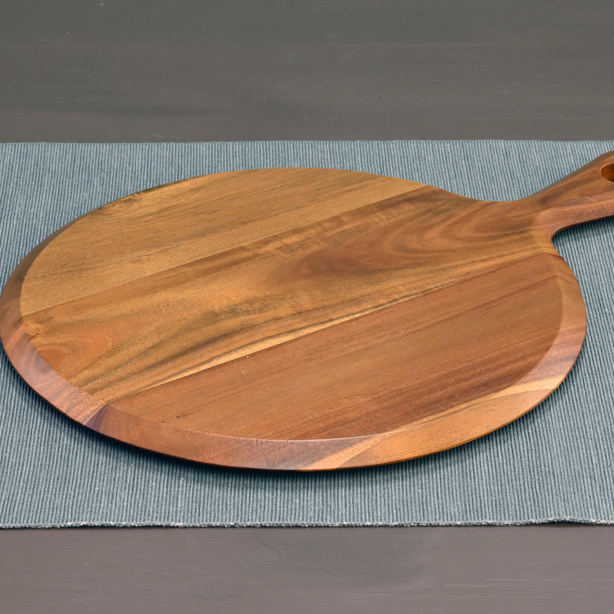丸型のカッティングボードです。縞模様の美しい木目が特徴的なアカシア素材を使用しています。プレート代わりにカットした食材をのせて、カフェ気分が味わえるようなアイテムです。