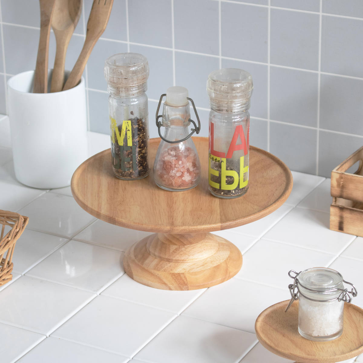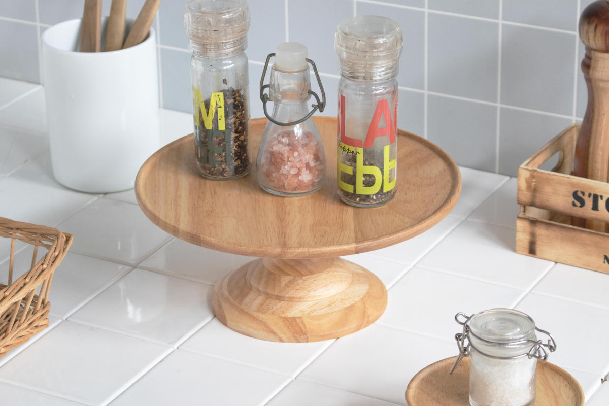 高さのあるコンポートディッシュは、スパイススタンドとしても活躍します。調味料ボトルやスパイスジャーをまとめて置くことで、キッチン周りをすっきり整理できます。ダイニングテーブルに置きっぱなしにしても見せる収納としてさりげないアクセントを添えてくれます。