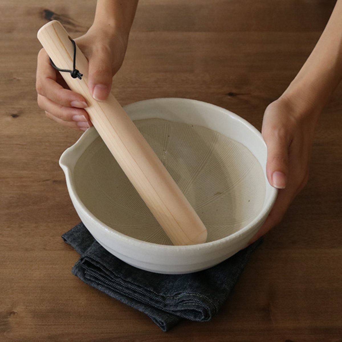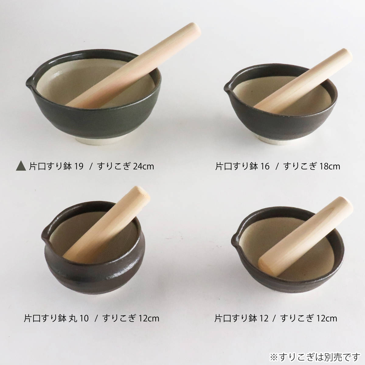 片口すり鉢は、12cm・16cm・19cm・丸10cmの4サイズございます。別売ですり鉢と相性の良いすりこぎがございます。片口すり鉢に合わせて、お好みのサイズをお選びください。