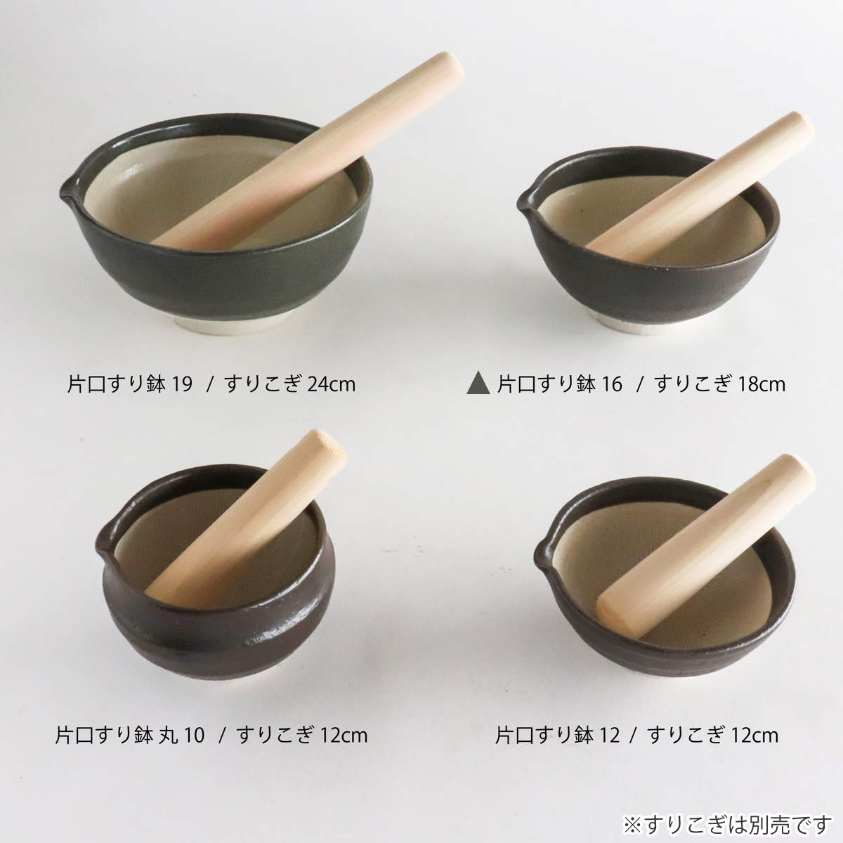 片口すり鉢は、12cm・16cm・19cm・丸10cmの4サイズございます。別売ですり鉢と相性の良いすりこぎがございます。片口すり鉢に合わせて、お好みのサイズをお選びください。