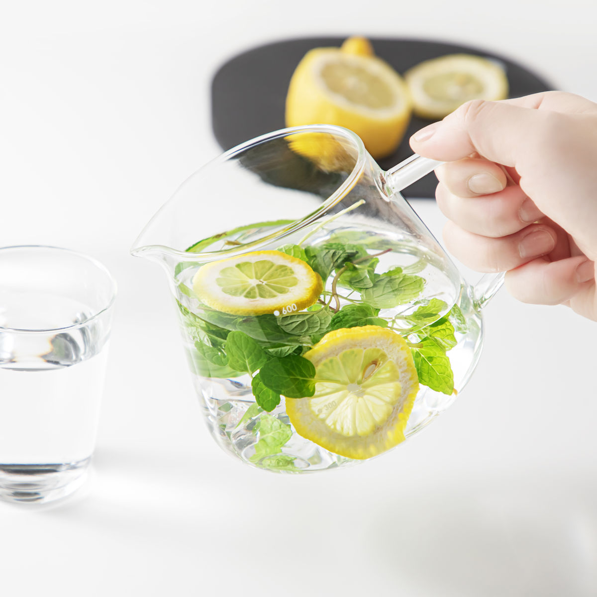 どんなシーンにも溶け込むシンプルで美しいガラスのデザイン。色やにおい移りが気にならないガラス製だからコーヒーや紅茶だけでなく、フレーバーウォーターにもおすすめです。