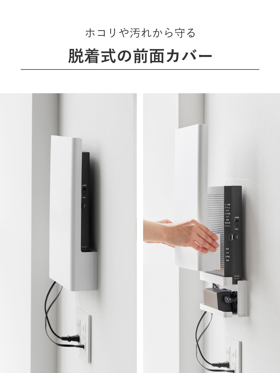 前面カバーは脱着式なので、ルーターの再起動の際にも便利です。気になるホコリからしっかりと守ってくれるので、お手入れも簡単です。いたずら防止にもなり、見た目だけではなく使いやすさにもこだわりました。