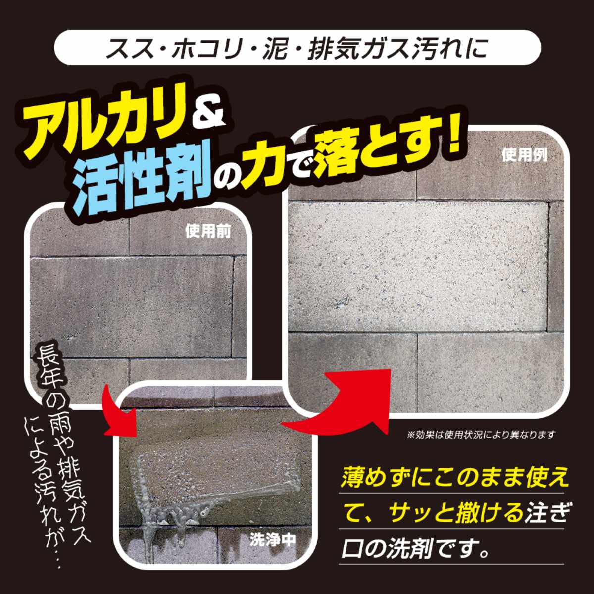 ススやホコリ、泥汚れや排気ガスなどの汚れをアルカリと活性剤の力で落とします。