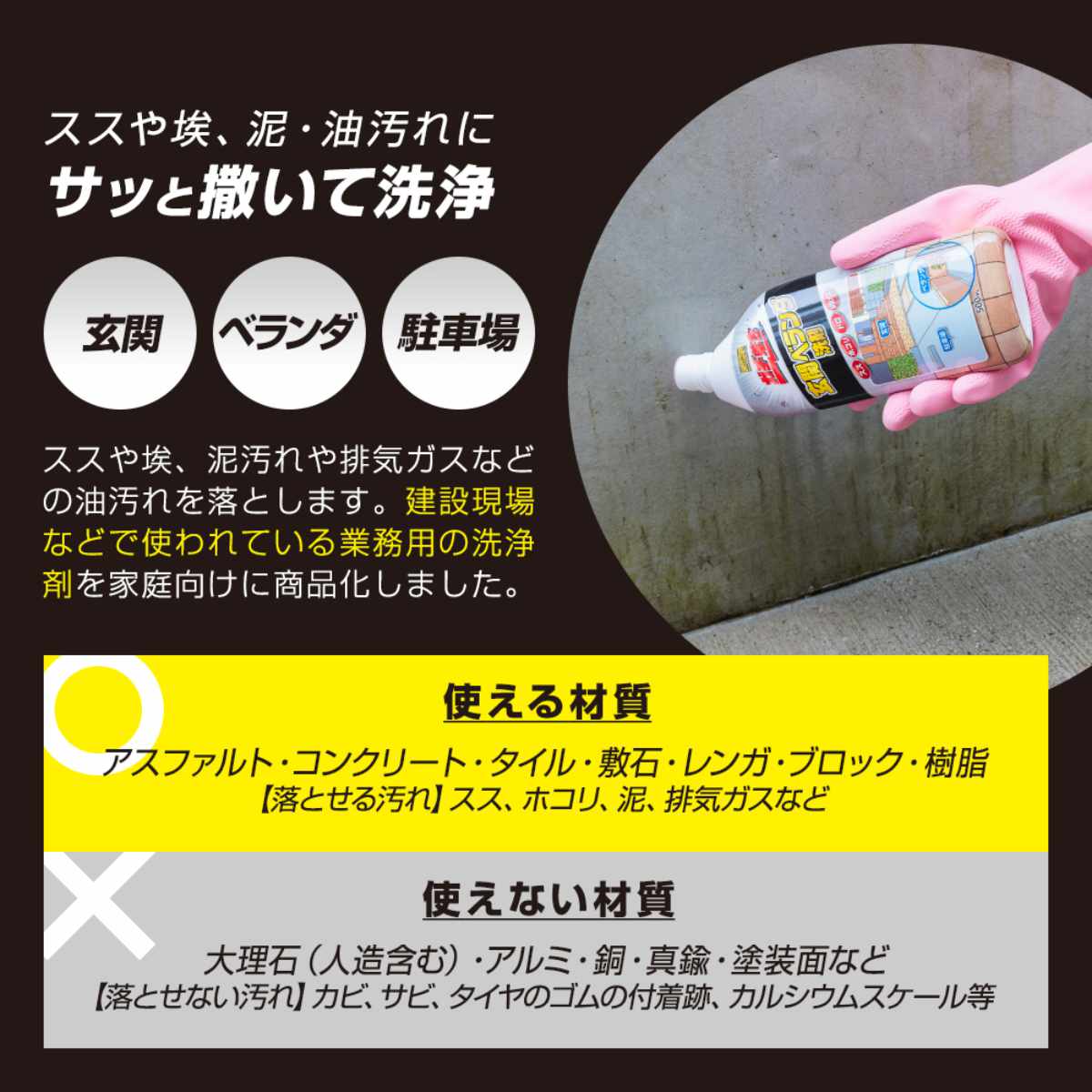 建設現場などでも使われている業務用の洗浄剤を、家庭向けに商品化した洗剤です。ベランダ、玄関、駐車場などの洗浄に最適です。