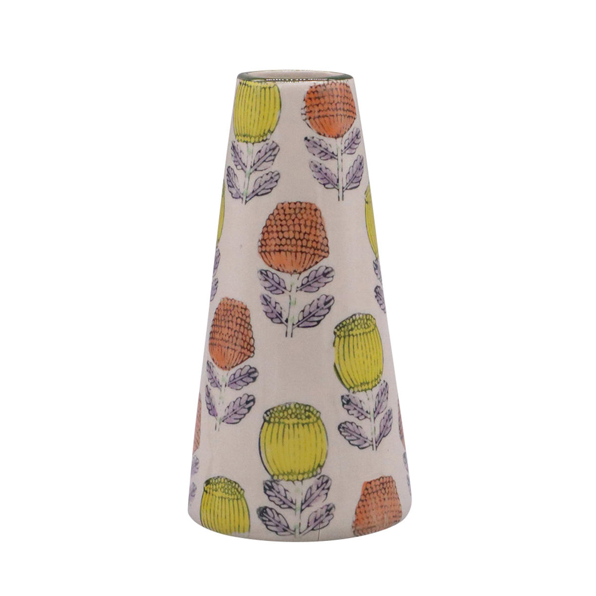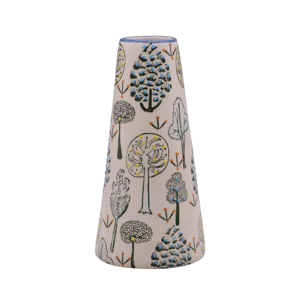 全体に散りばめられた植物の柄と鮮やかな色使いが可愛いフラワーベースです。一輪ざしにもちょうどいいサイズ感です。個性的で遊び心のある空間を演出できます。