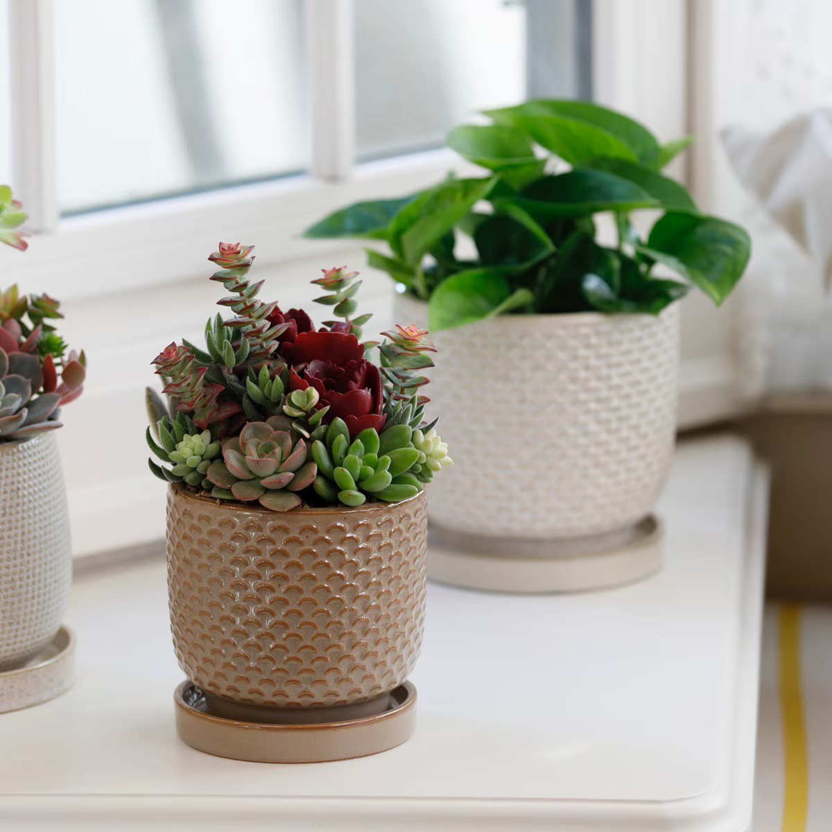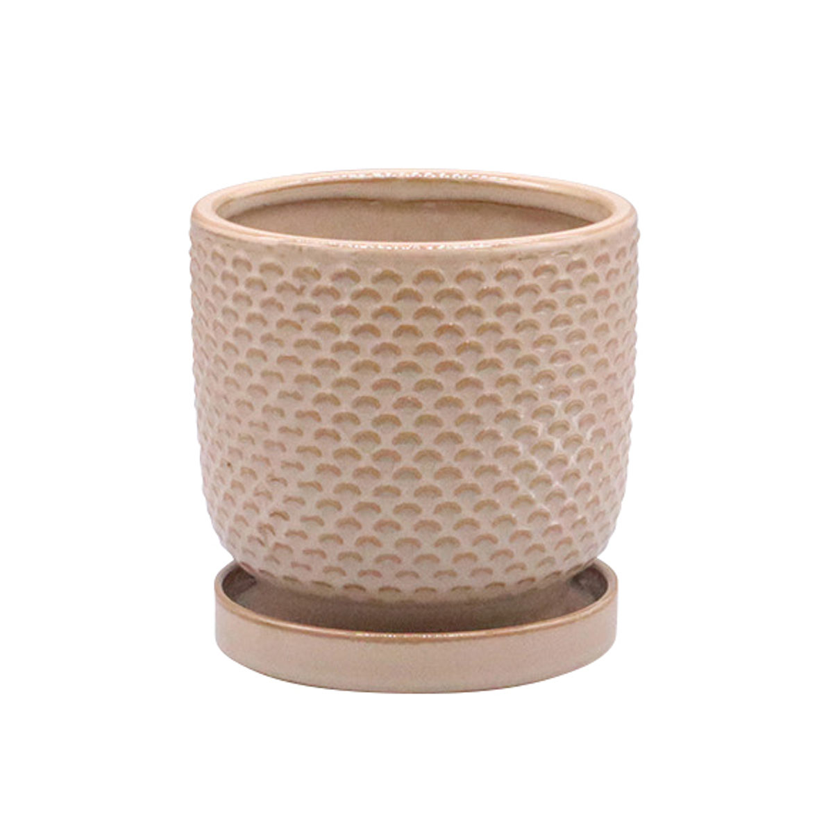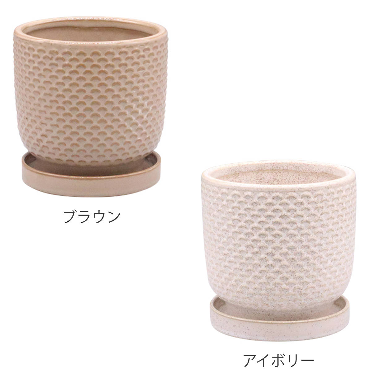 さりげないパターン柄が可愛いフラワーポットです。表面には光沢のある釉薬を使用し、植物をより活き活きと引き立たせます。底面には水抜き用の底穴が空いています。受け皿がついているので室内での使用にも最適です。