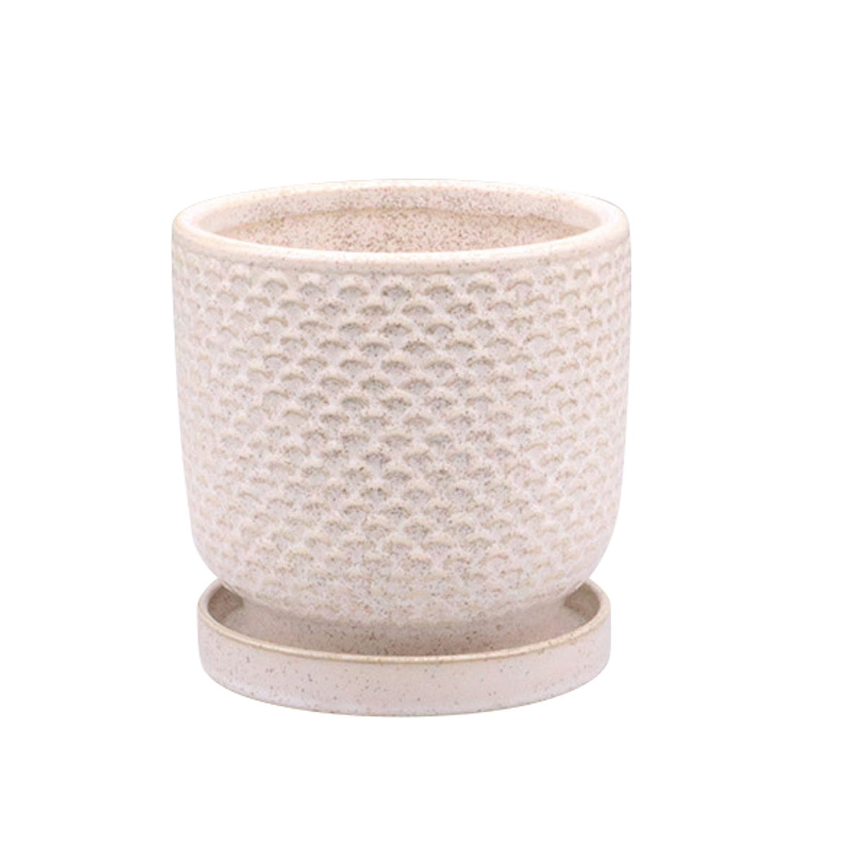 さりげないパターン柄が可愛いフラワーポットです。表面には光沢のある釉薬を使用し、植物をより活き活きと引き立たせます。底面には水抜き用の底穴が空いています。受け皿がついているので室内での使用にも最適です。