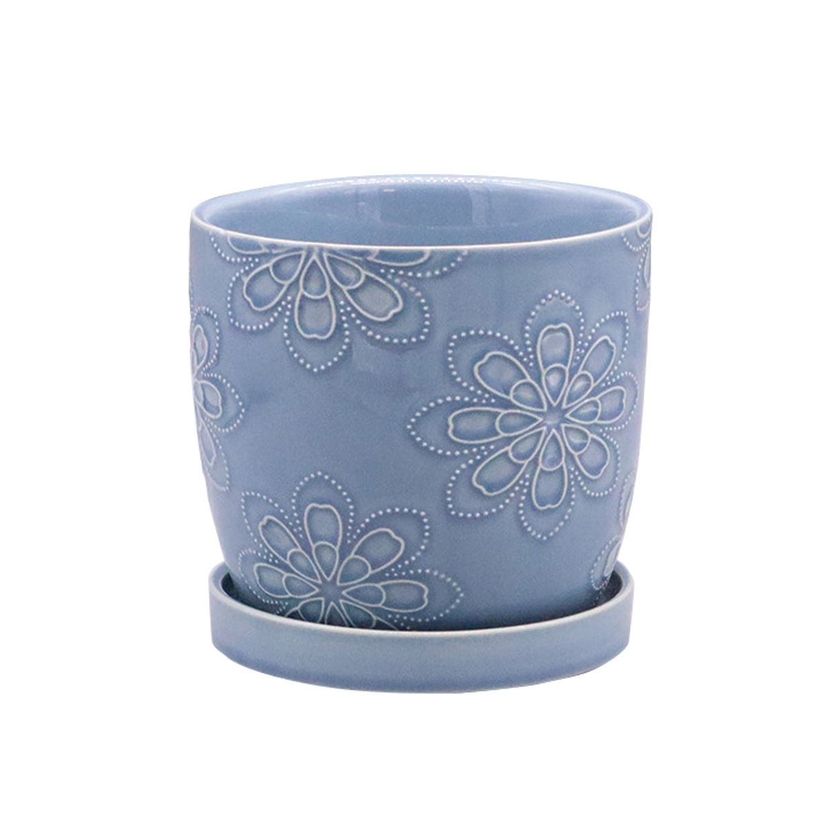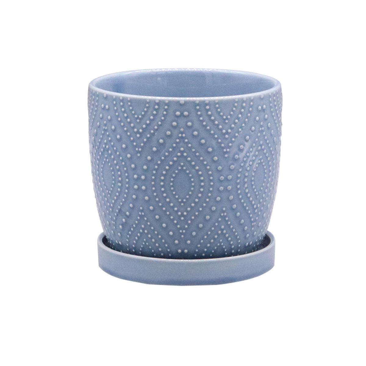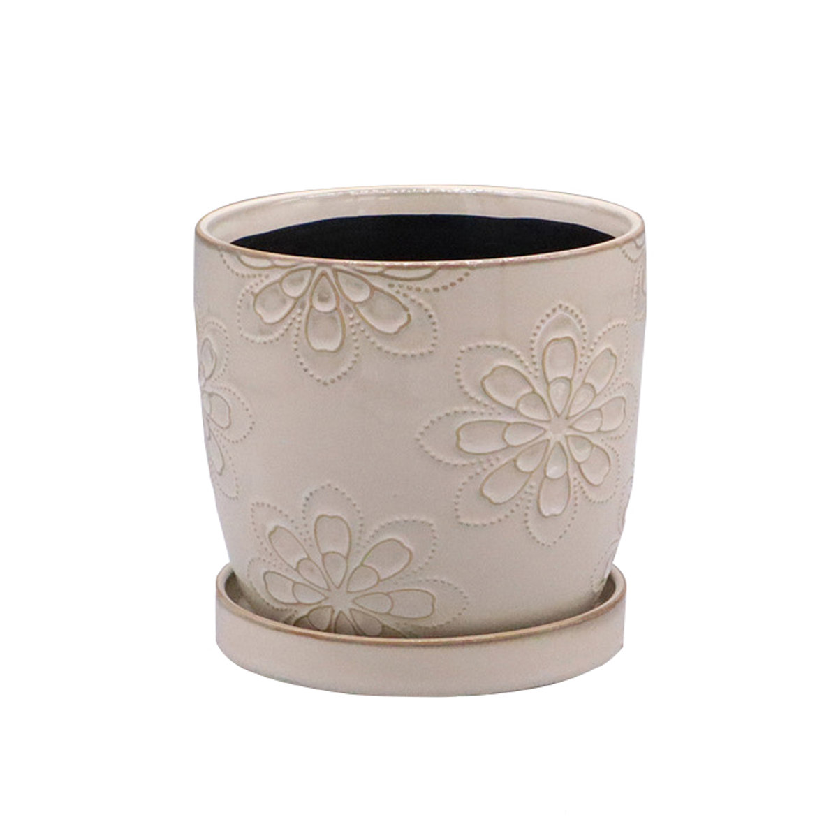 細かいパターン柄とニュアンスカラーがきれいなフラワーポットです。表面には光沢のある釉薬を使用し、植物をより活き活きと引き立たせます。底面には水抜き用の底穴が空いています。受け皿がついているので室内での使用にも最適です。