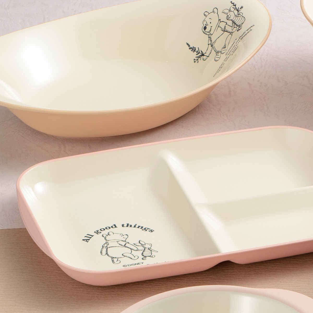 仲良しピグレットとの睦まじさを表現した愛らしいデザインです。落ち着いた色合いが優しく、食卓にもおしゃれに馴染みます。