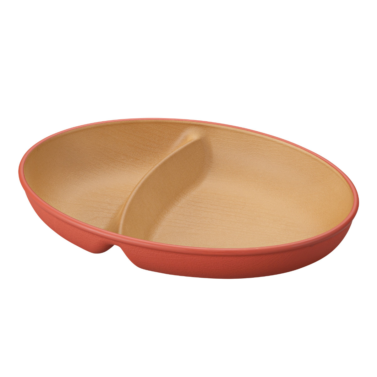 2つの仕切りがあるオーバル型のプレートで、少し深さがあり、汁気のものも混ざらず盛り付けができます。カレーとサラダなどを一緒に盛り付けてワンプレートで食事が楽しめます。