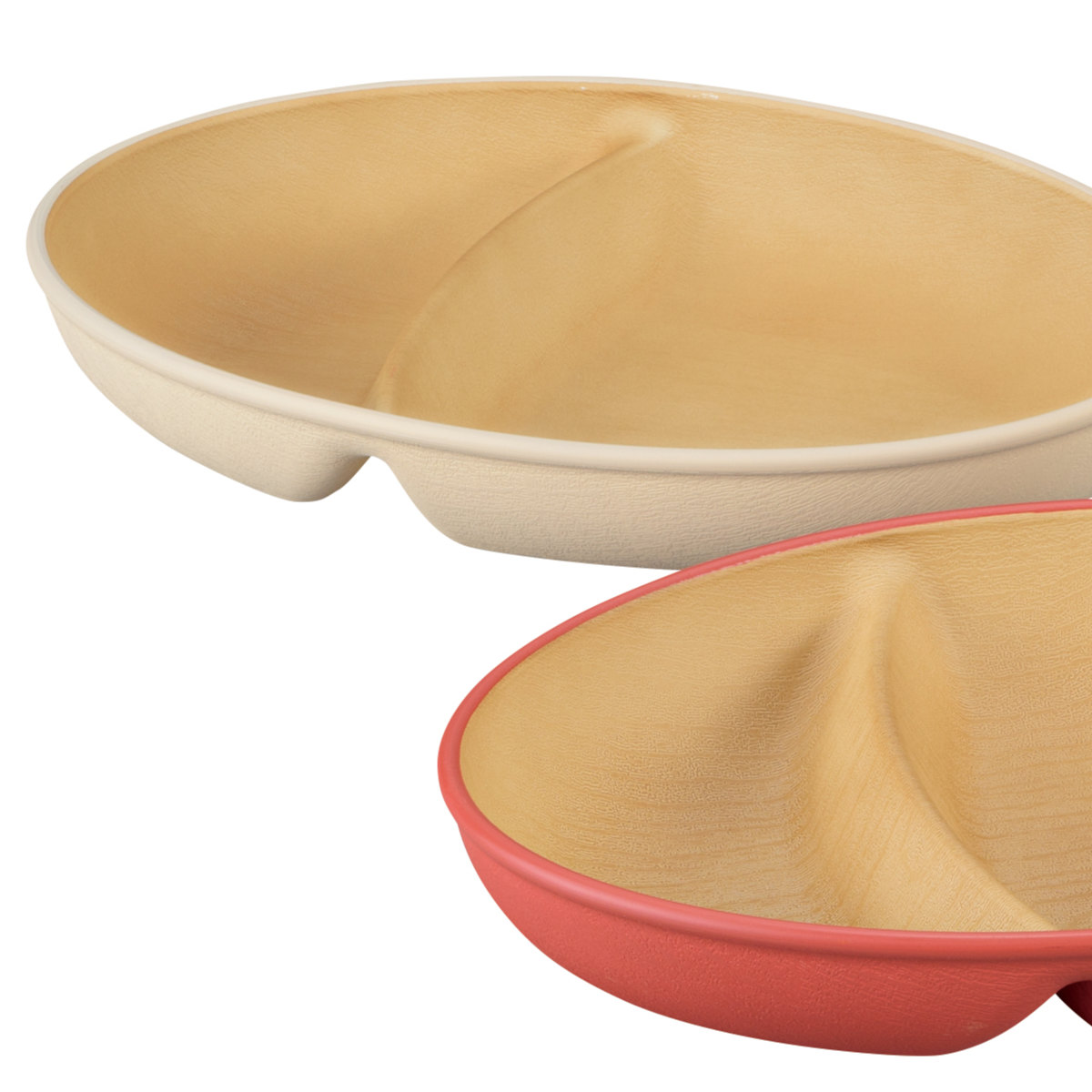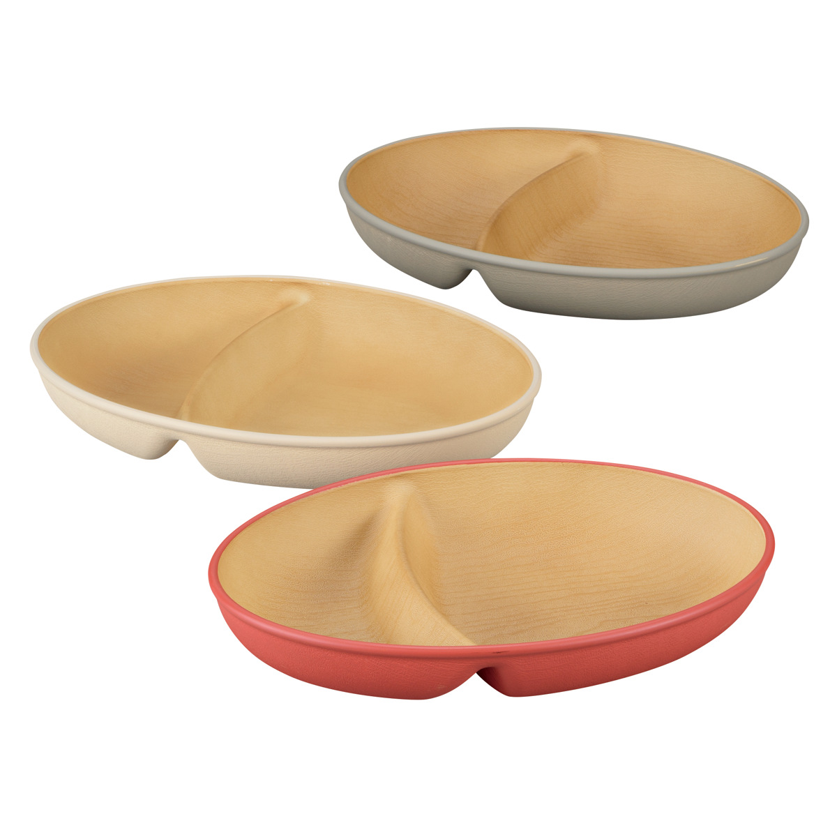 サラダやトースト、フルーツやホットケーキを乗せた朝食やおやつにもぴったりな2つの仕切りプレートです。グレー、アイボリー、レッド各1枚のセットです。
