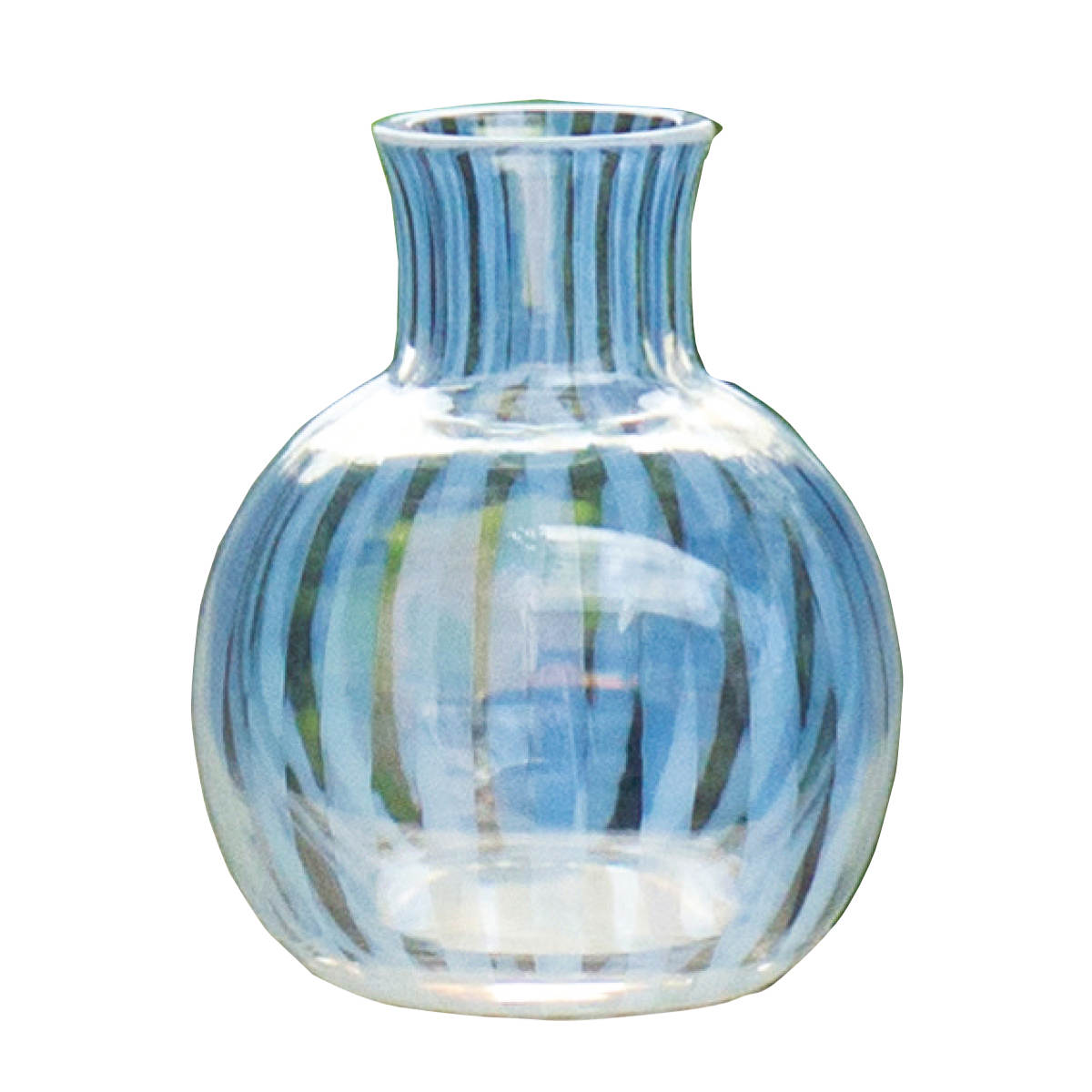 爽やかな印象の硝子製の花瓶です。透明感のある硝子に青の模様が特徴的。光を受けて表情を変え、置く場所ごとに異なる魅力を放ちます。涼しげな印象は、夏の装飾や爽やかな空間演出にもぴったりです。