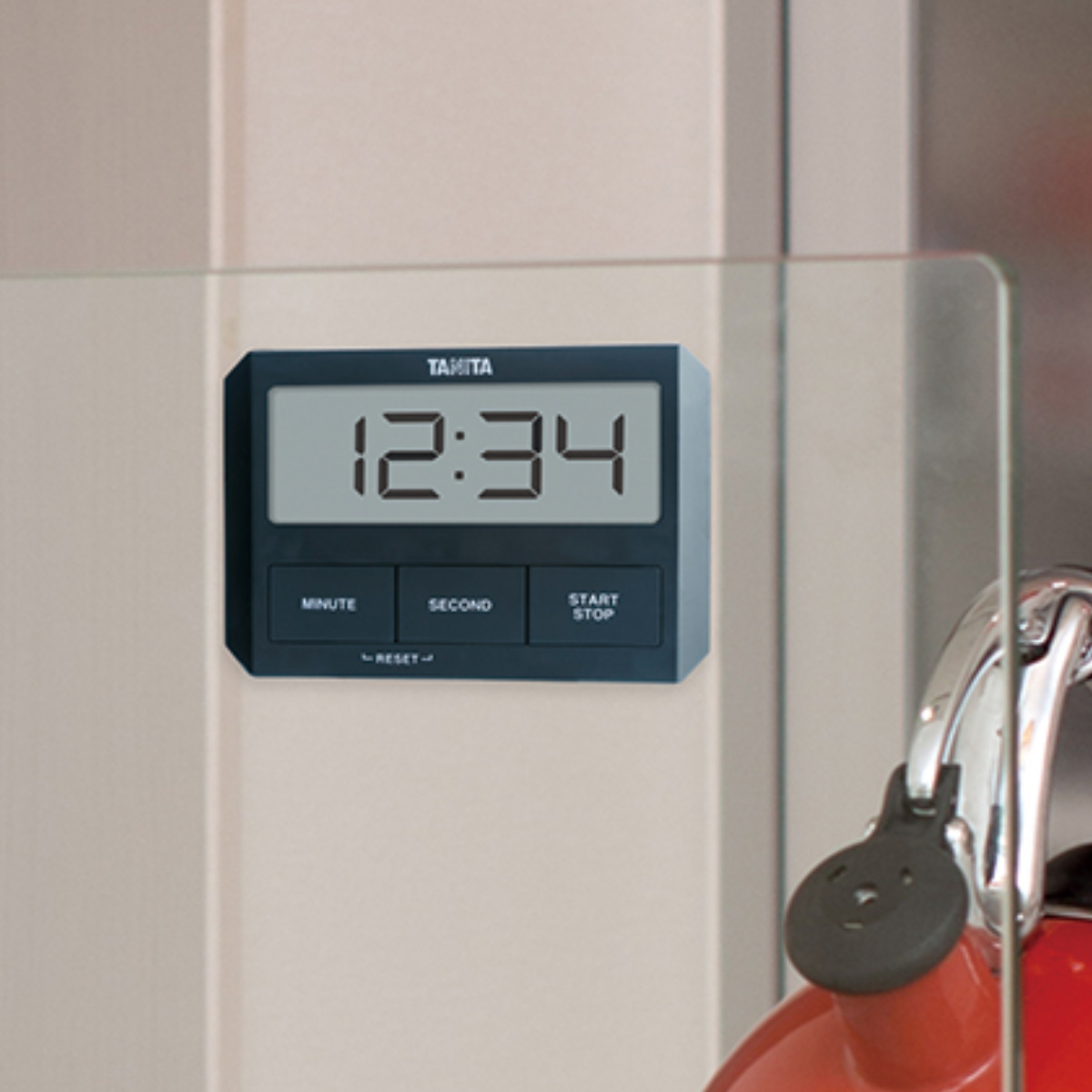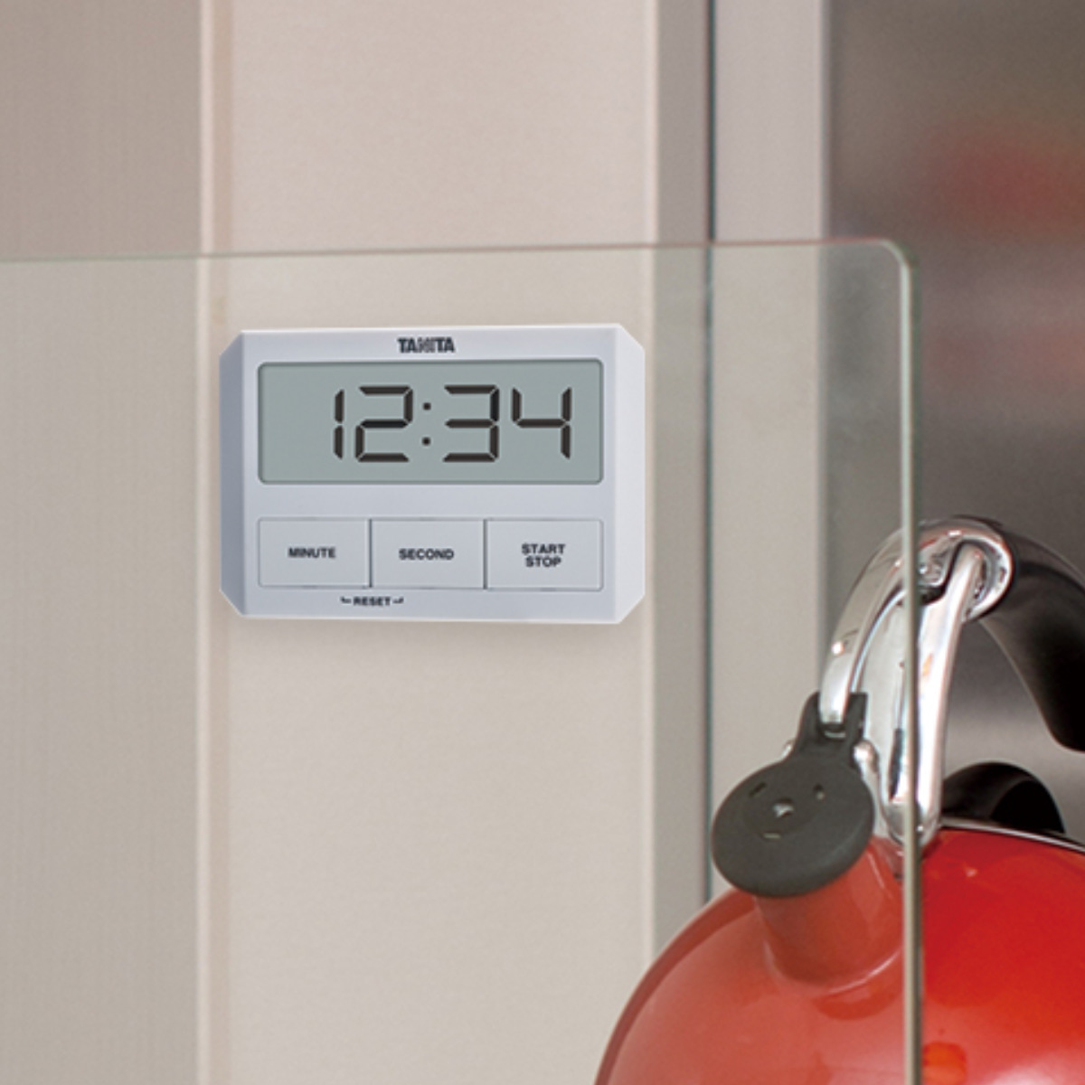 マグネットでは付かない、ガラスにも付けられるキッチンタイマーです。特殊な吸盤を使用しているので、凹凸がなく乾燥した平らでなめらかな面(ガラス、金属、タイルなど)に貼り付け可能です。スタイリッシュなデザインなので、おしゃれなシステムキッチンにもぴったりです。