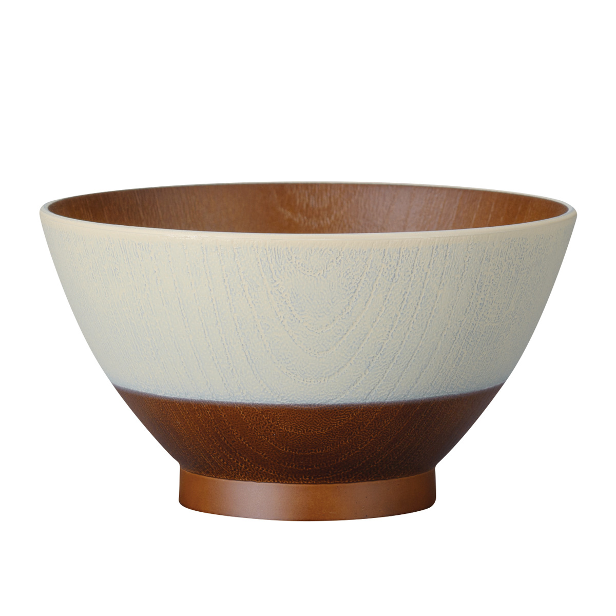 器の外側と内側には木目調のデザインが施されています。食卓に馴染みやすく、温かい雰囲気に包まれるような、ぬくもりを感じられるデザインです。