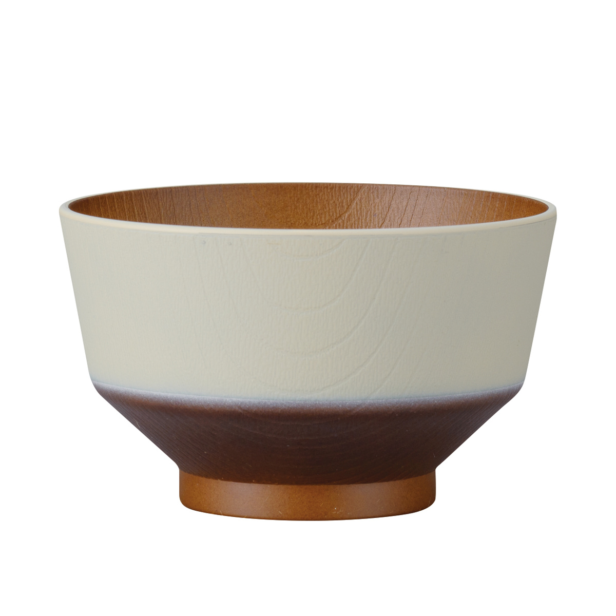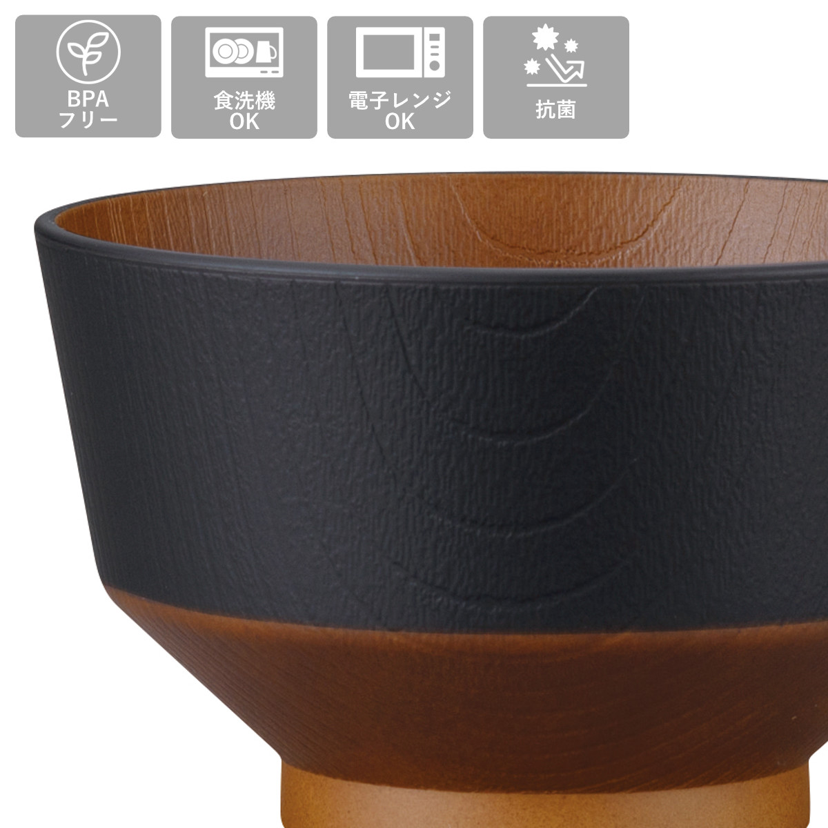 器の外側と内側には木目調のデザインが施されています。食卓に馴染みやすく、温かい雰囲気に包まれるような、ぬくもりを感じられるデザインです。