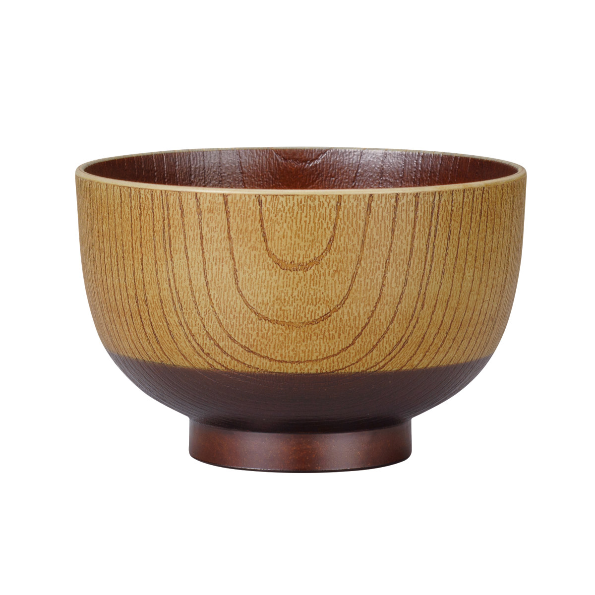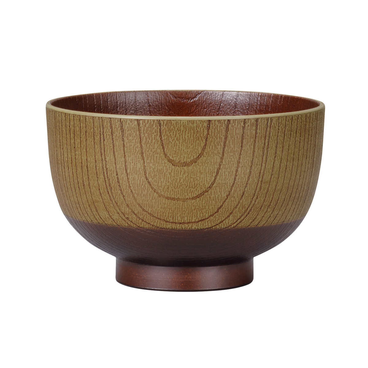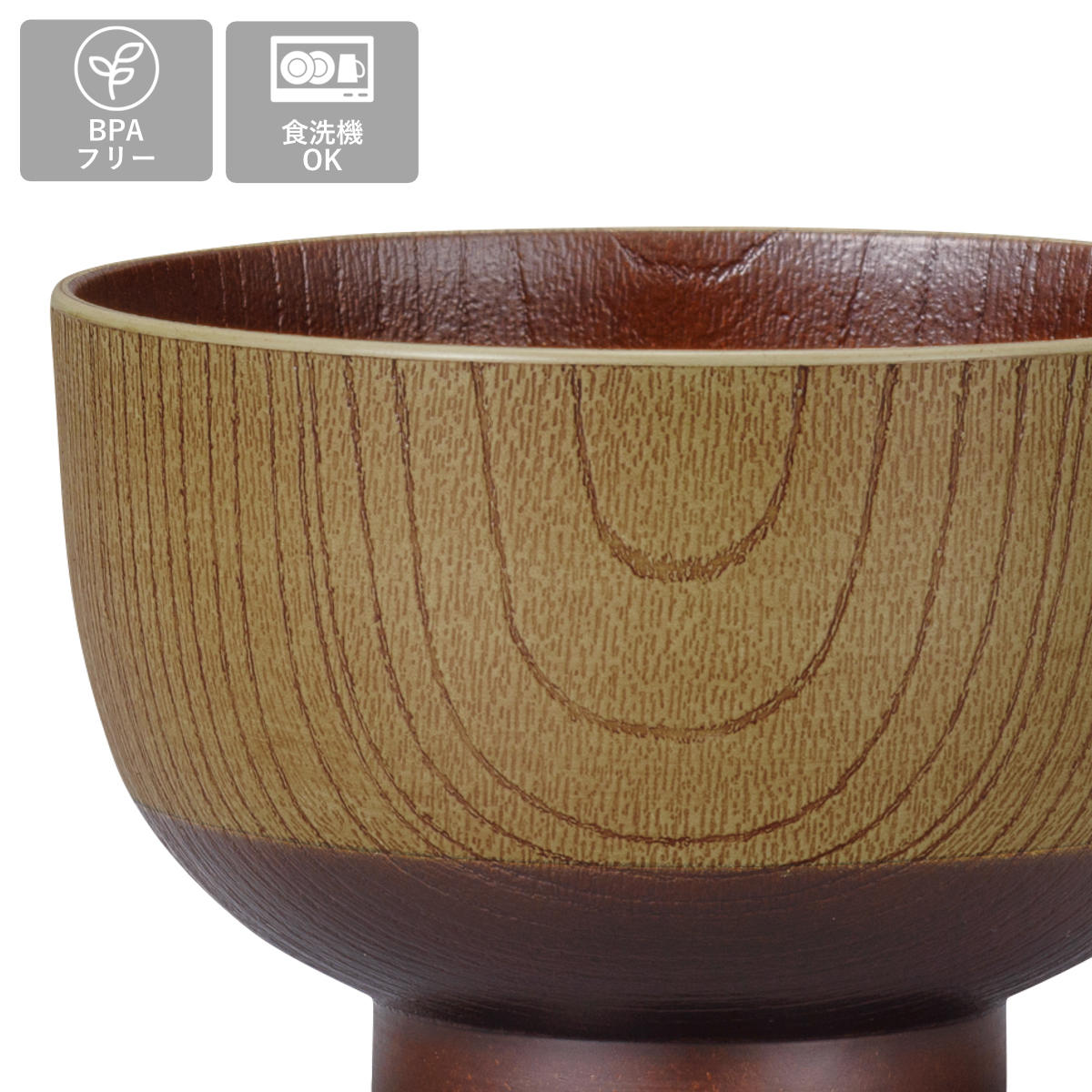 器の外側と内側には木目調のデザインが施されています。食卓に馴染みやすく、温かい雰囲気に包まれるような、ぬくもりを感じられるデザインです。
