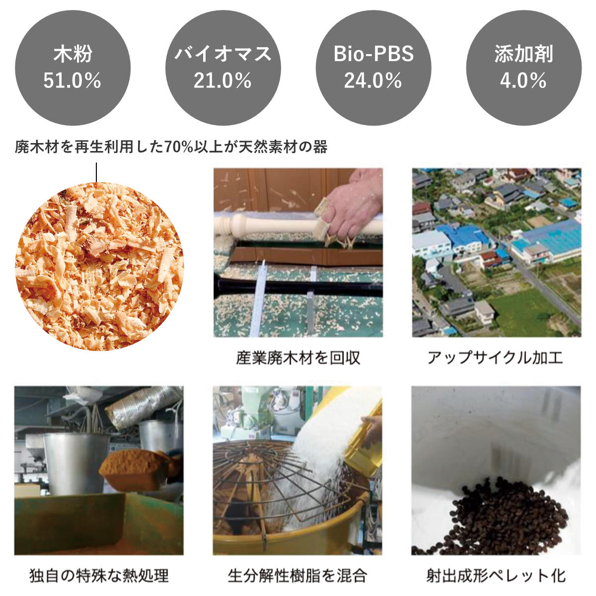 | 材質 | 素材:木粉51%、バイオマス(原材料とうもろこし)21%、Bio-PBS24%、添加剤4% 塗:漆 BPAフリー |