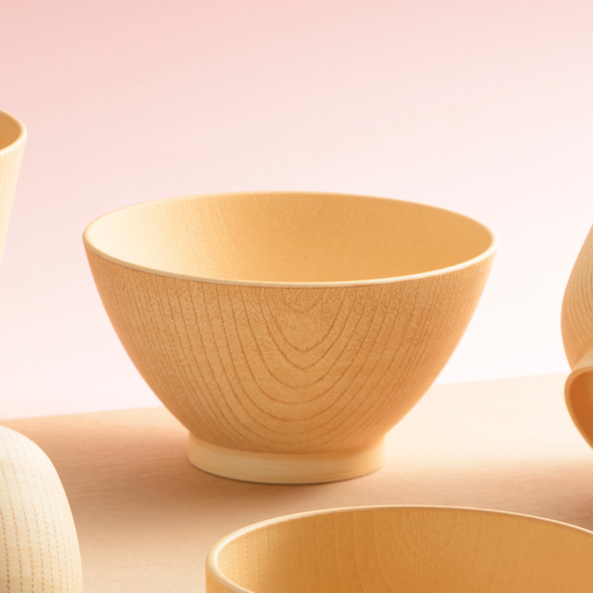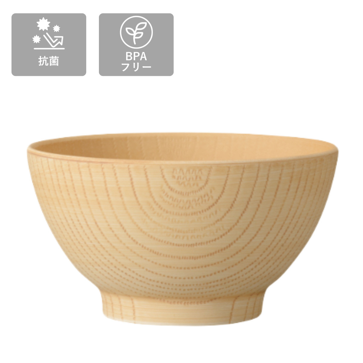 まるで白木のような美しい木目デザインの飯椀です。軽くて割れにくく、扱いやすい樹脂製の食器なので毎日手軽にお使いいただけます。お子様がお茶碗として使いやすいサイズで、普段使いはもちろん、来客用としてもおすすめです。シーンを選ばないデザインで、和でも洋でも合わせやすい器です。