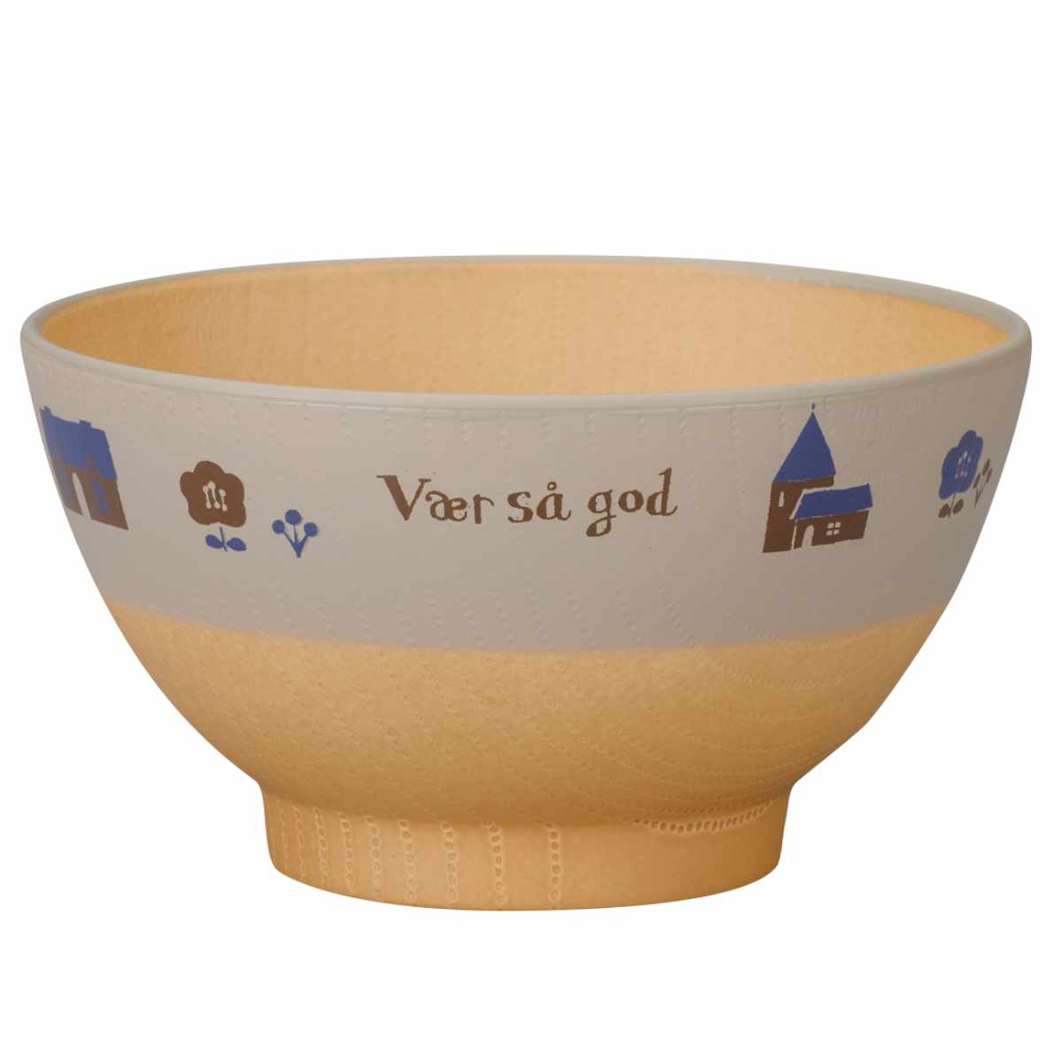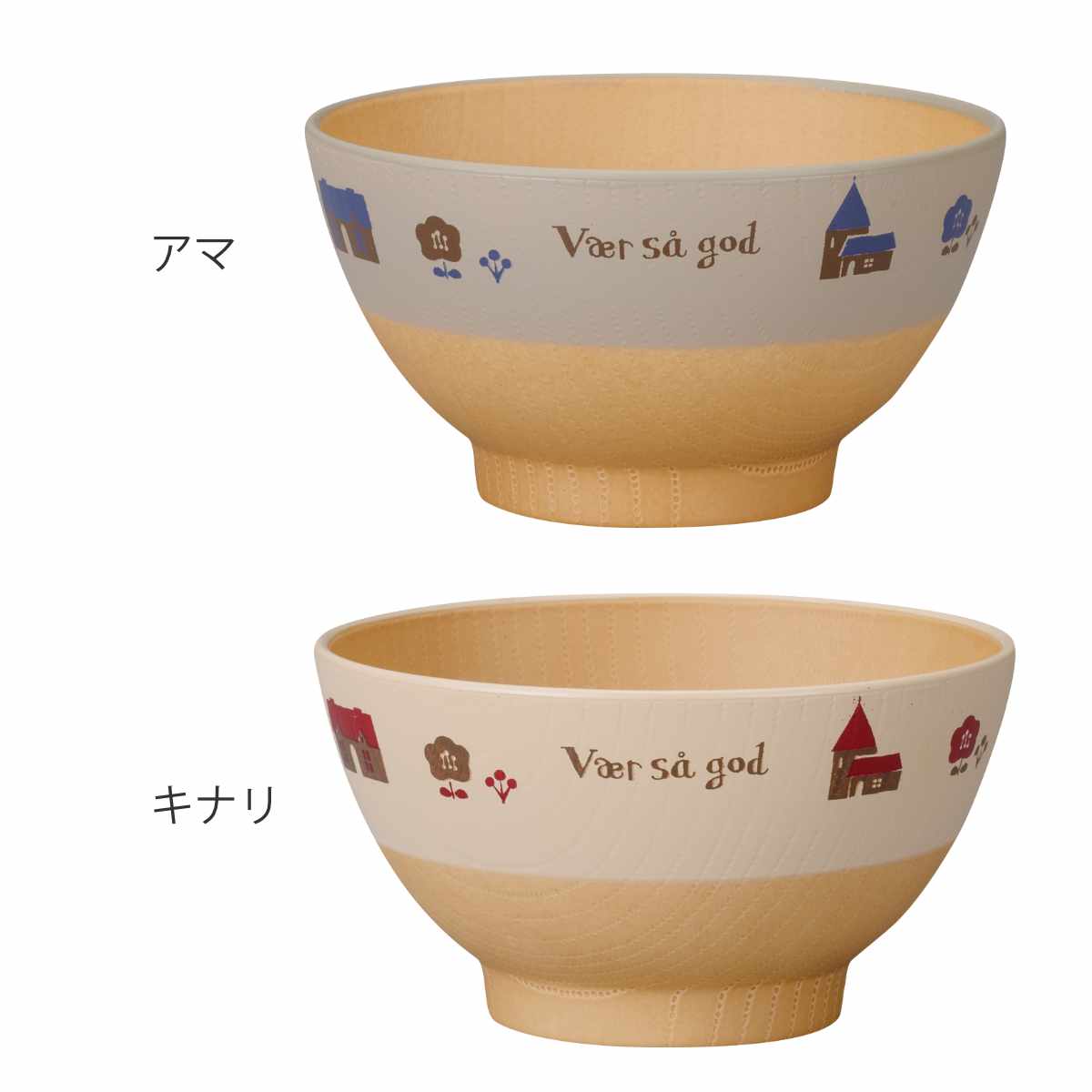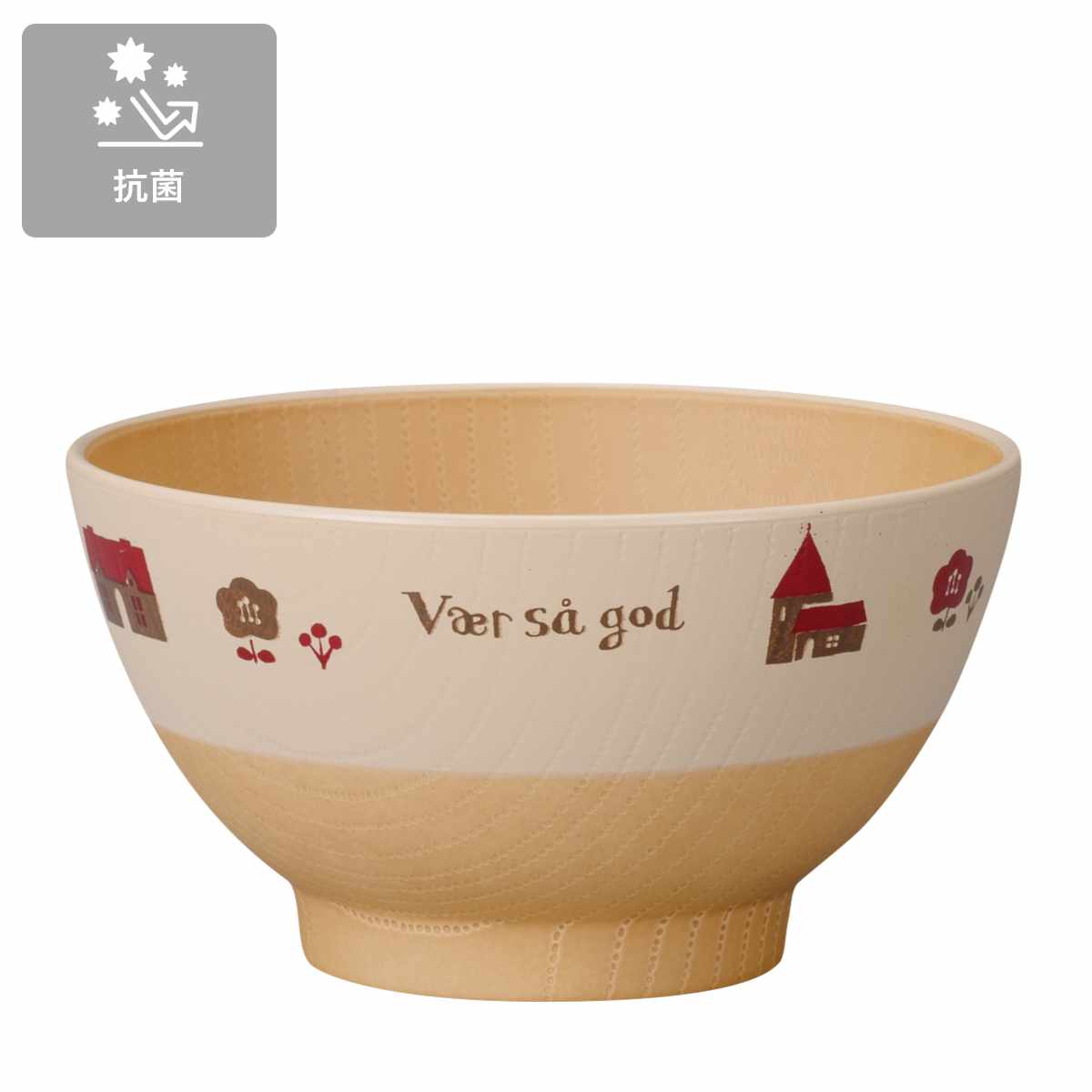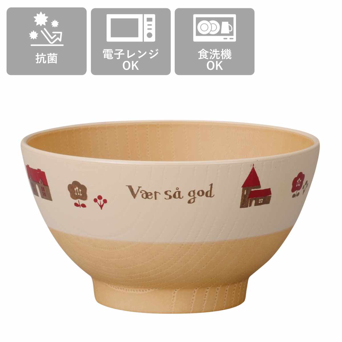 ●和でも洋でも合わせやすい木目調の子ども用飯わんです。