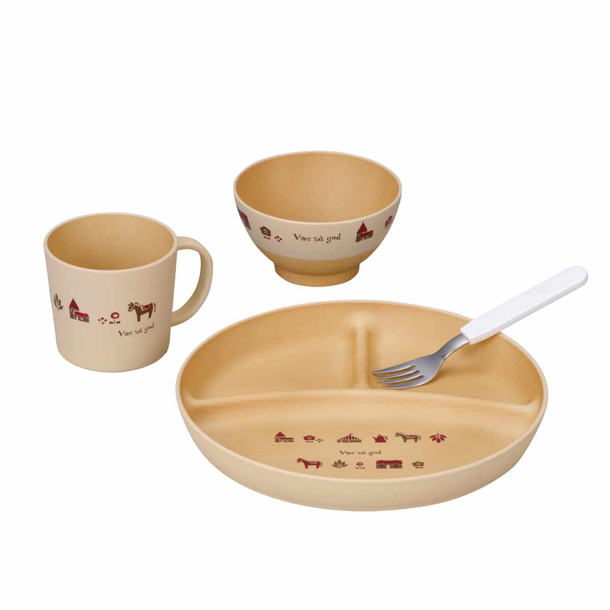 飯わん、マグ、ランチプレート、フォークのセットです。離乳食期からお子様が成長後も普段使いとして長くお使いいただけます。充実したセット内容で、贈り物にもおすすめです。