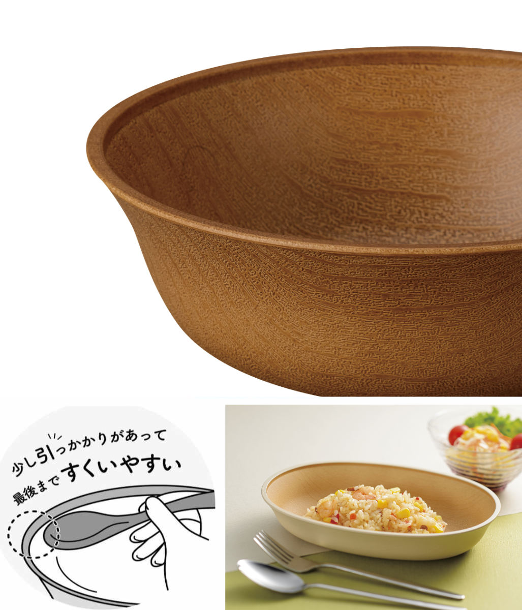 ころんと丸く深い形状で、サラダはもちろん、スープやデザートなど幅広い料理に使えるボウルです。温かみのある木の風合いが感じられる木目調で、毎日扱いやすい樹脂製の食器です。