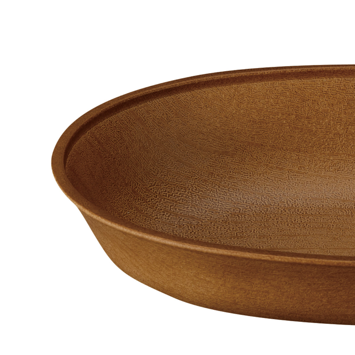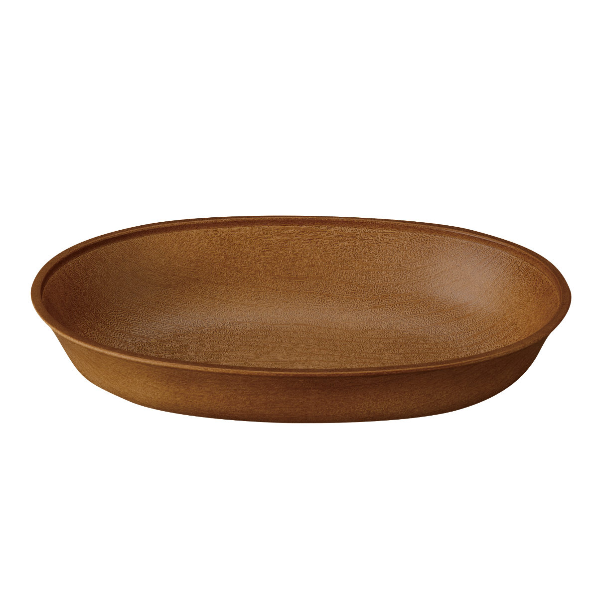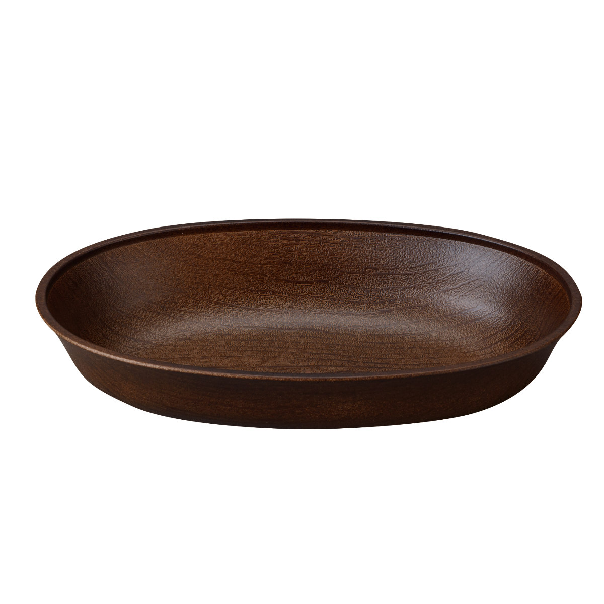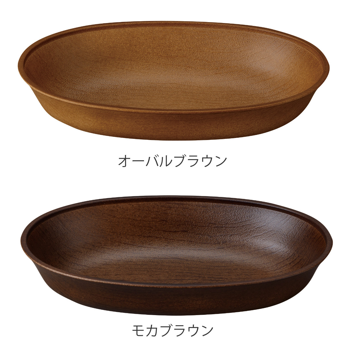 一人分のパスタやオムライスの盛り付け、カレーを盛り付けるのにもぴったりな大きさの小判型ボウルです。程よい深さがあり、汁気のあるお料理にも使いやすいです。温かみのある木の風合いが感じられる木目調で、毎日扱いやすい樹脂製の食器です。