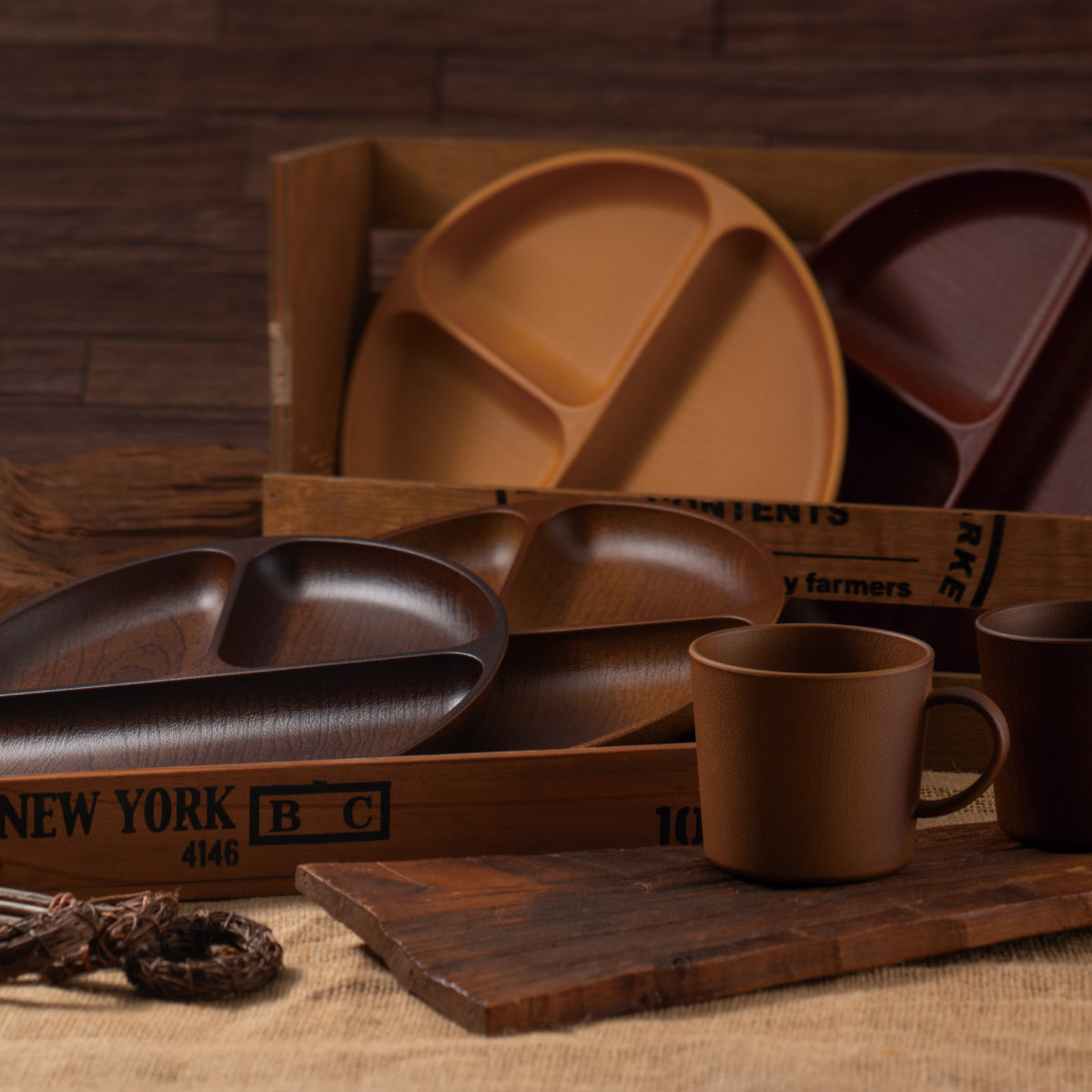 自然な木の雰囲気をそのまま再現した「woody(ウッディー)」シリーズです。木のぬくもりが感じられるwoodyシリーズで揃えれば、食卓がナチュラルな雰囲気に包まれます。自然にも馴染むデザインはアウトドアシーンにもぴったりです。