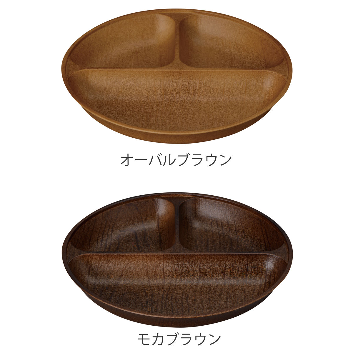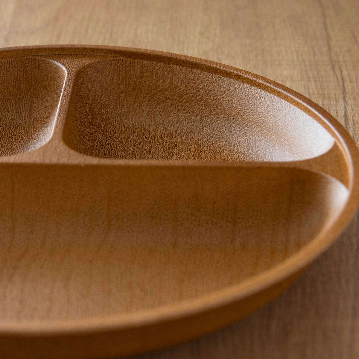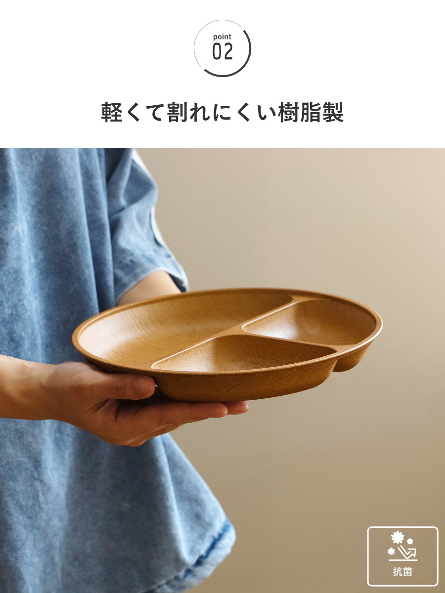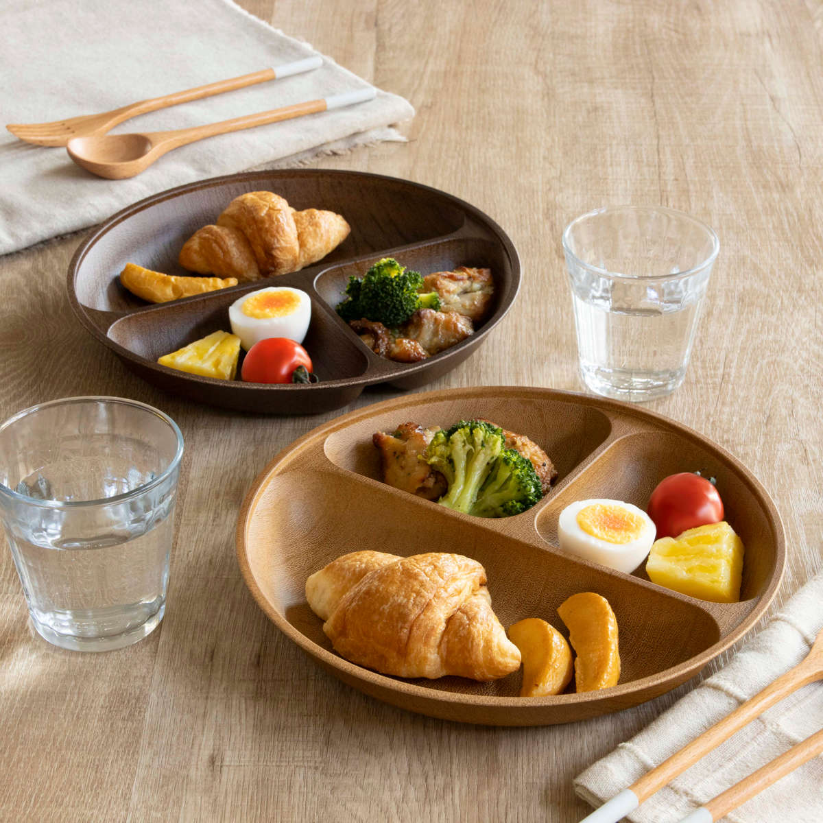 気軽にカフェのようなランチが楽しめる、木製風のランチプレートです。朝食やランチにはワンプレートごはん、夕食にはおかずやおつまみを取り分ける仕切り皿に。食卓の様々なシーンで使えるので、毎日使う食器の定番アイテムとして活躍してくれます。
