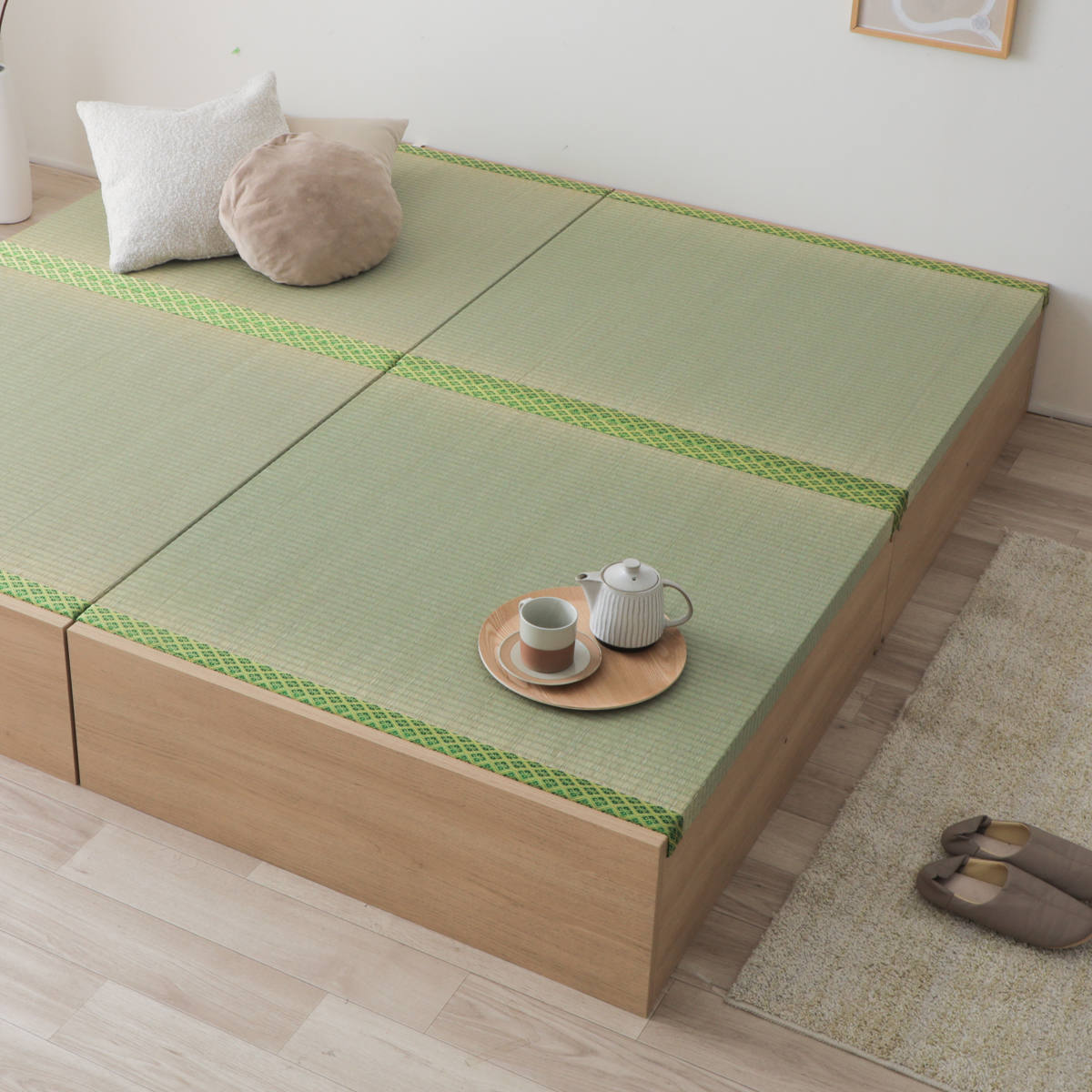 お部屋の一角に設置するだけで、簡単に小上がりをつくることができます。和室がないお家でも、リフォーム不要で気軽に和のくつろぎ空間を取り入れられます。ごろんと寝転んだり、洗濯物を畳んだり、お子さまのお昼寝スペースとしても◎