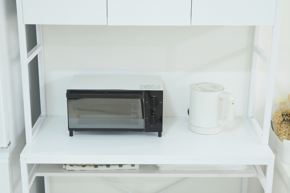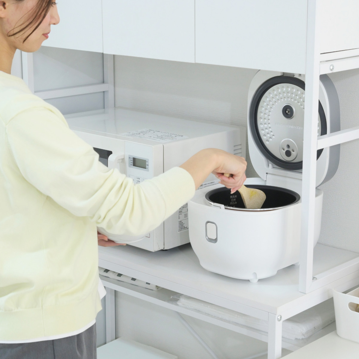 オープン部は炊飯器や電気ケトルなどキッチン家電を置くのにちょうどいいスペースです。フレーム構造でゆとりがあるので、配線がしやすく家電の熱も逃がします。