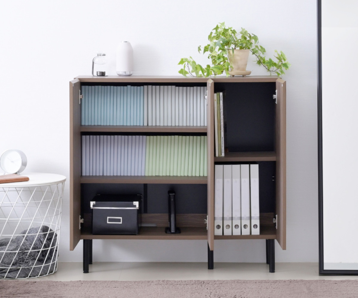 扉内には本やDVDなどをたっぷり収納でき、天板にはお気に入りの小物や植物を飾れる、スマートな本棚です。シンプルでコンパクト設計なので、スッキリと整ったお部屋になります。2枚扉と1枚扉の2部屋あるので、分けて収納することができます。