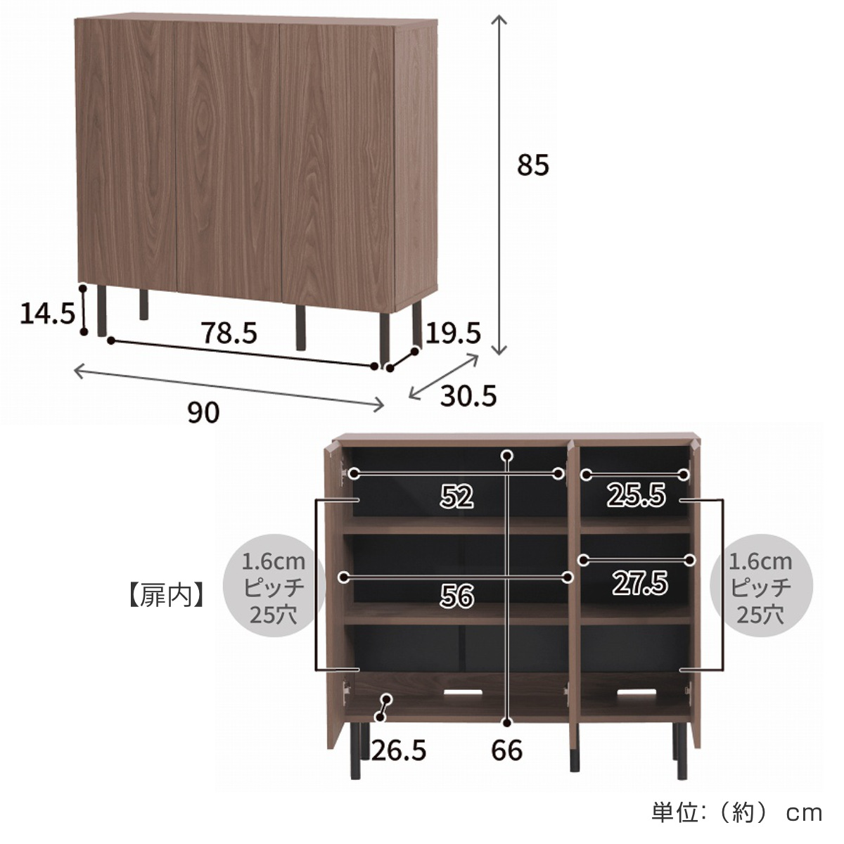 【2枚扉・1枚扉(可動棚各2枚):各1.6cmピッチ25段階】