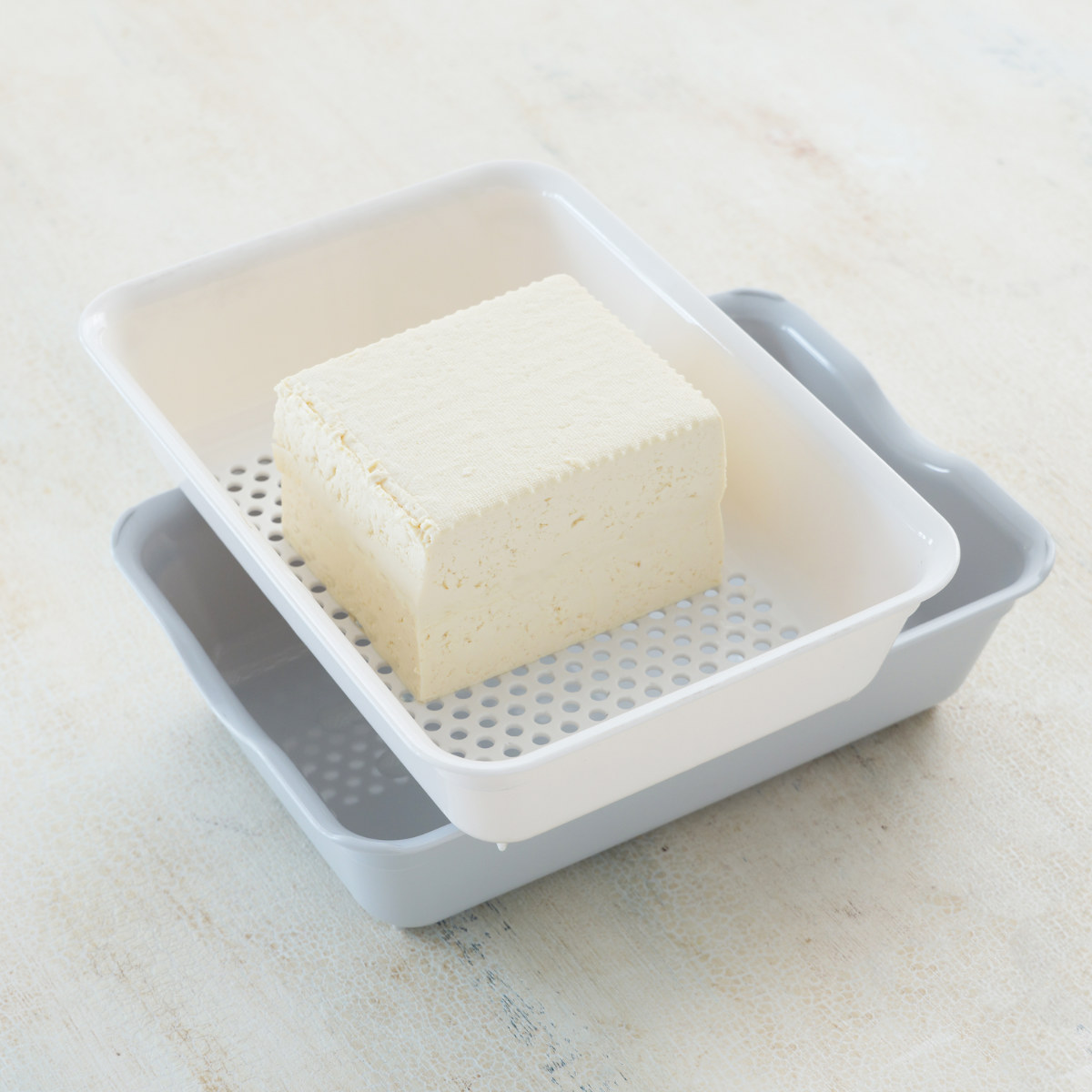 ザルとバットを積み重ねて置くだけで、豆腐やさらした野菜などをサッと水切りできます。