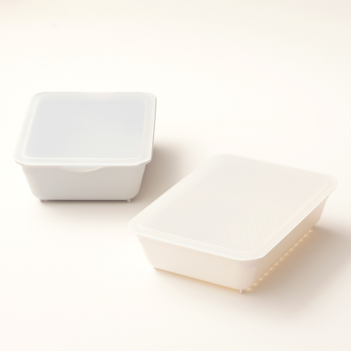 フタをすれば上に積み重ねられるので、省スペースで冷蔵庫に保存できます。フタはバットにもザルにもぴったり合います。
