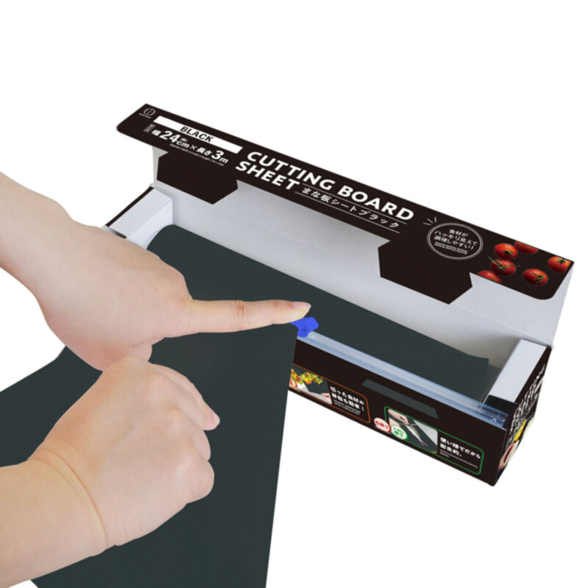 使う分だけ引き出して、スライドカッターで左右どちらからでも容易にカットすることができるまな板シートです。まな板に敷くだけで雑菌や色移り、ニオイ移りを防ぐことができます。