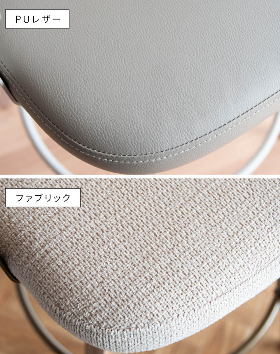 座面の張地はフレームカラーと雰囲気に合わせた2タイプです。ホワイト×グレーは上質なPUレザー、ナチュラル×ベージュとダークブラウン×ダークグレーは肌触りの良いファブリックを使用しています。