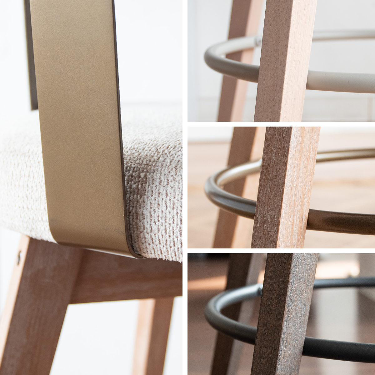 木目が美しい曲げ木フレームが特徴のスタイリッシュなバーチェアです。広めの座面設計と背中やお尻にフィットする曲線デザインの背もたれで、ゆったり快適にお座りいただけます。