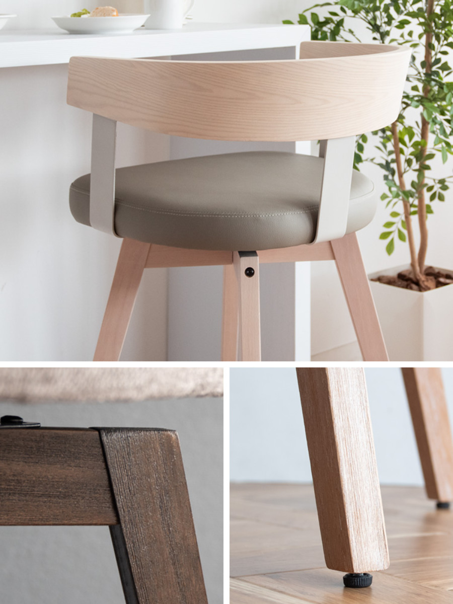 木目の美しい天然木突板を使用した角ばった脚部は温かみがありながらスタイリッシュな雰囲気を演出してくれます。底部にはアジャスターがありガタつきを軽減します。