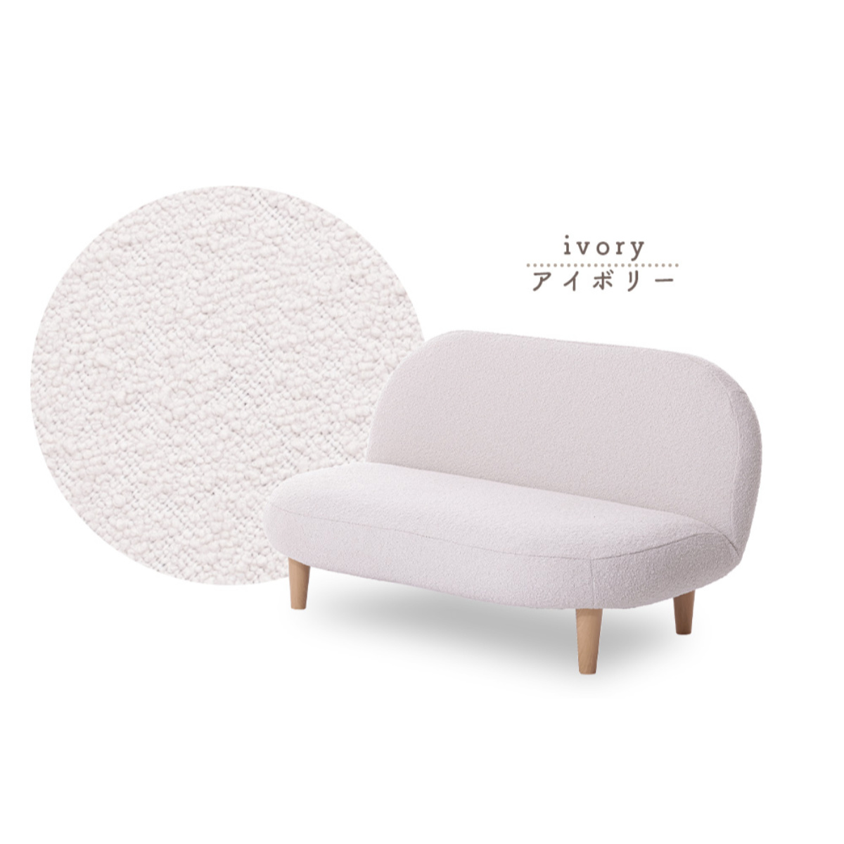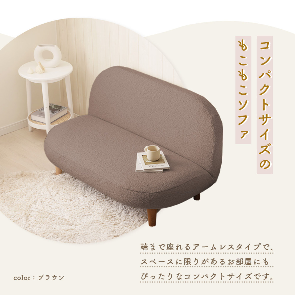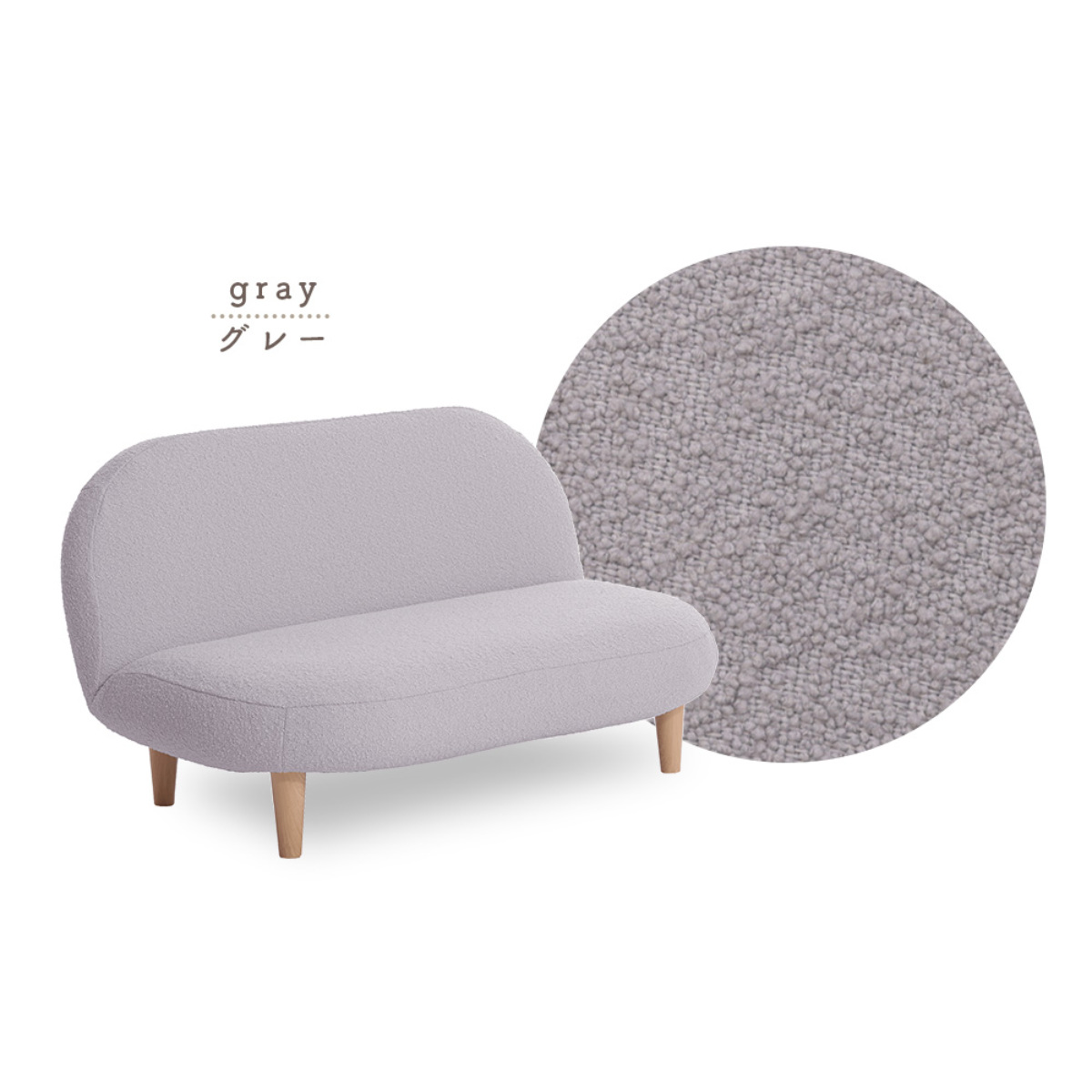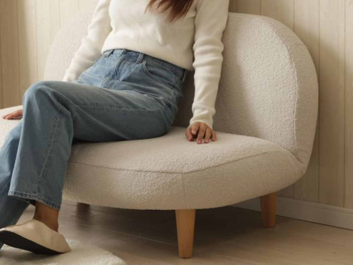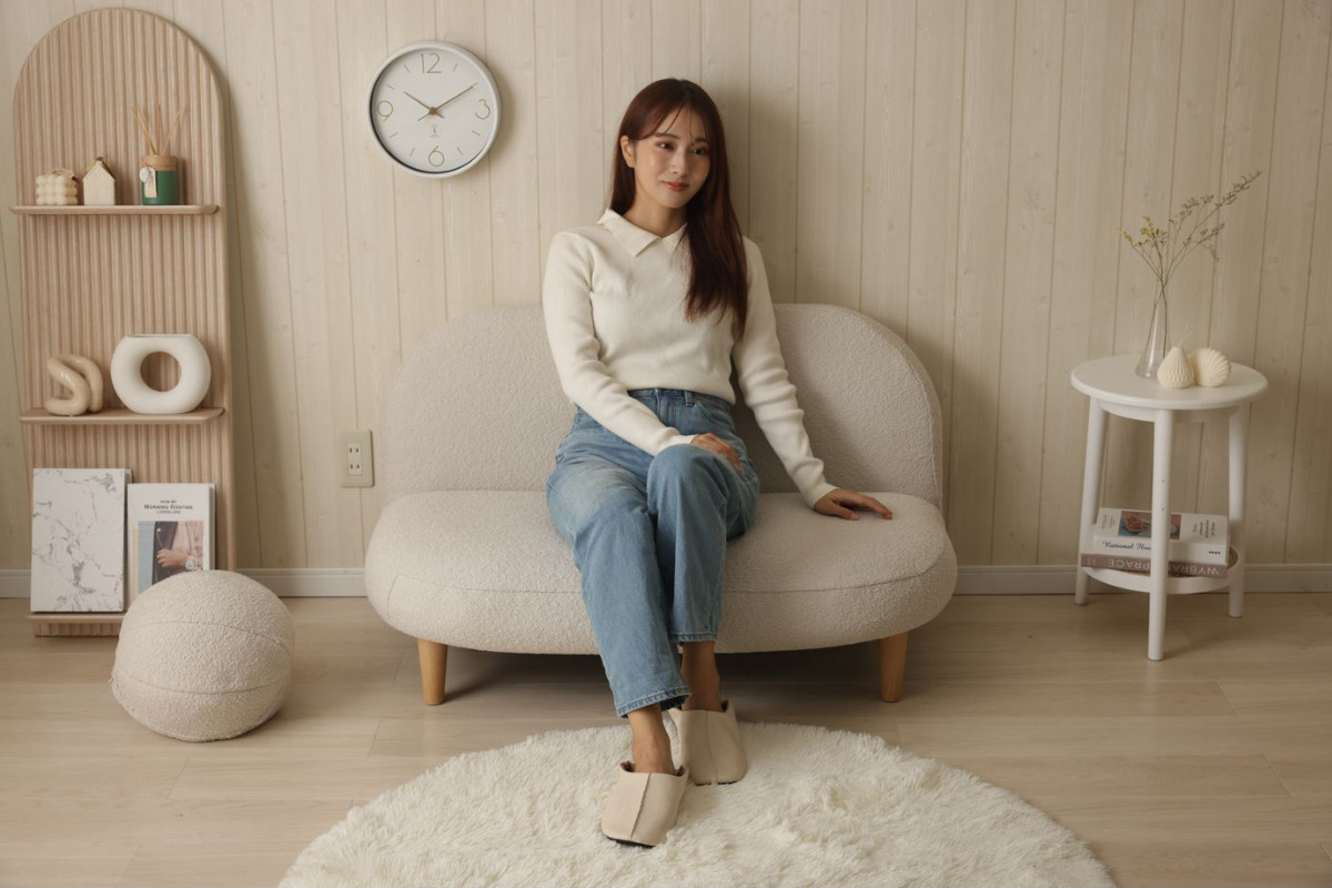 もこもことした質感の生地と落ち着いた淡い色味で、優しい雰囲気をプラスしてくれるソファです。スペースに限りがあるお部屋にもピッタリなコンパクトサイズで、置くだけでほっこりとした空間が広がります。