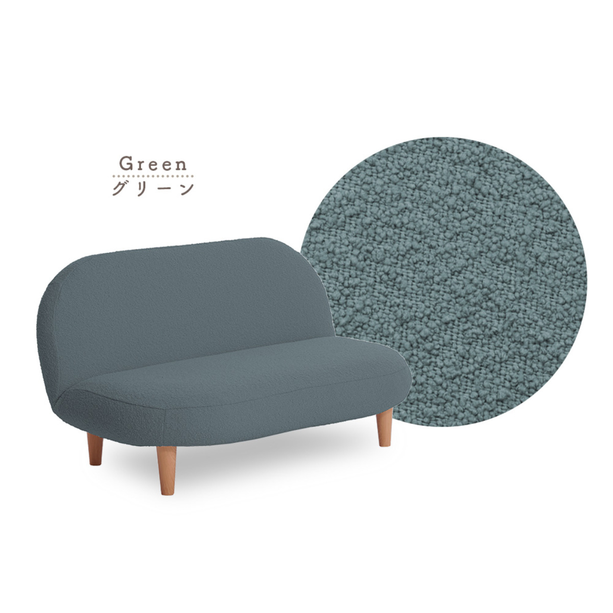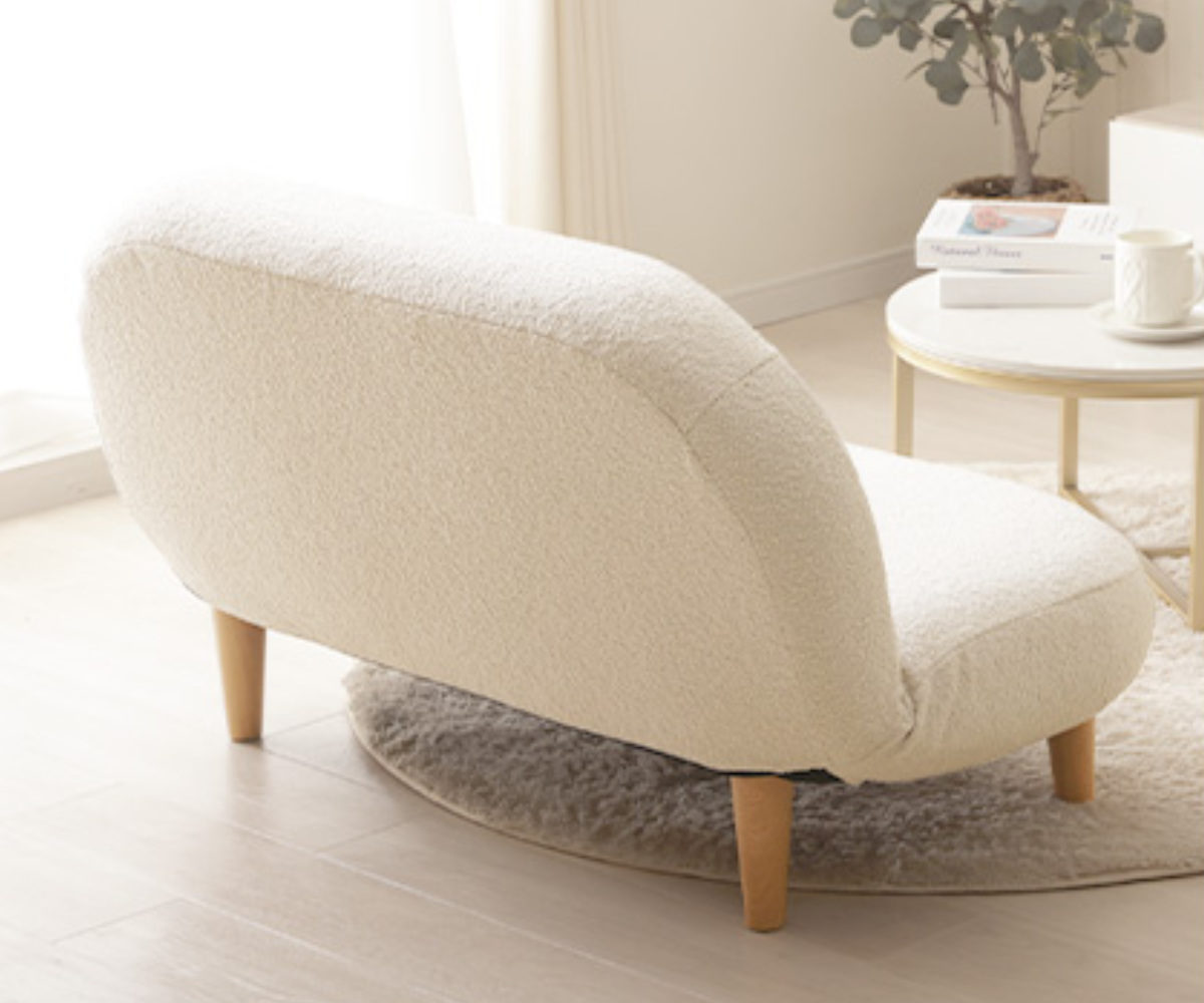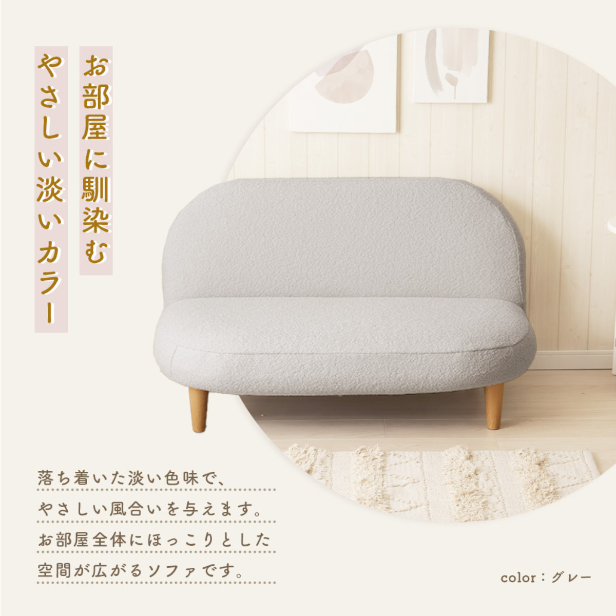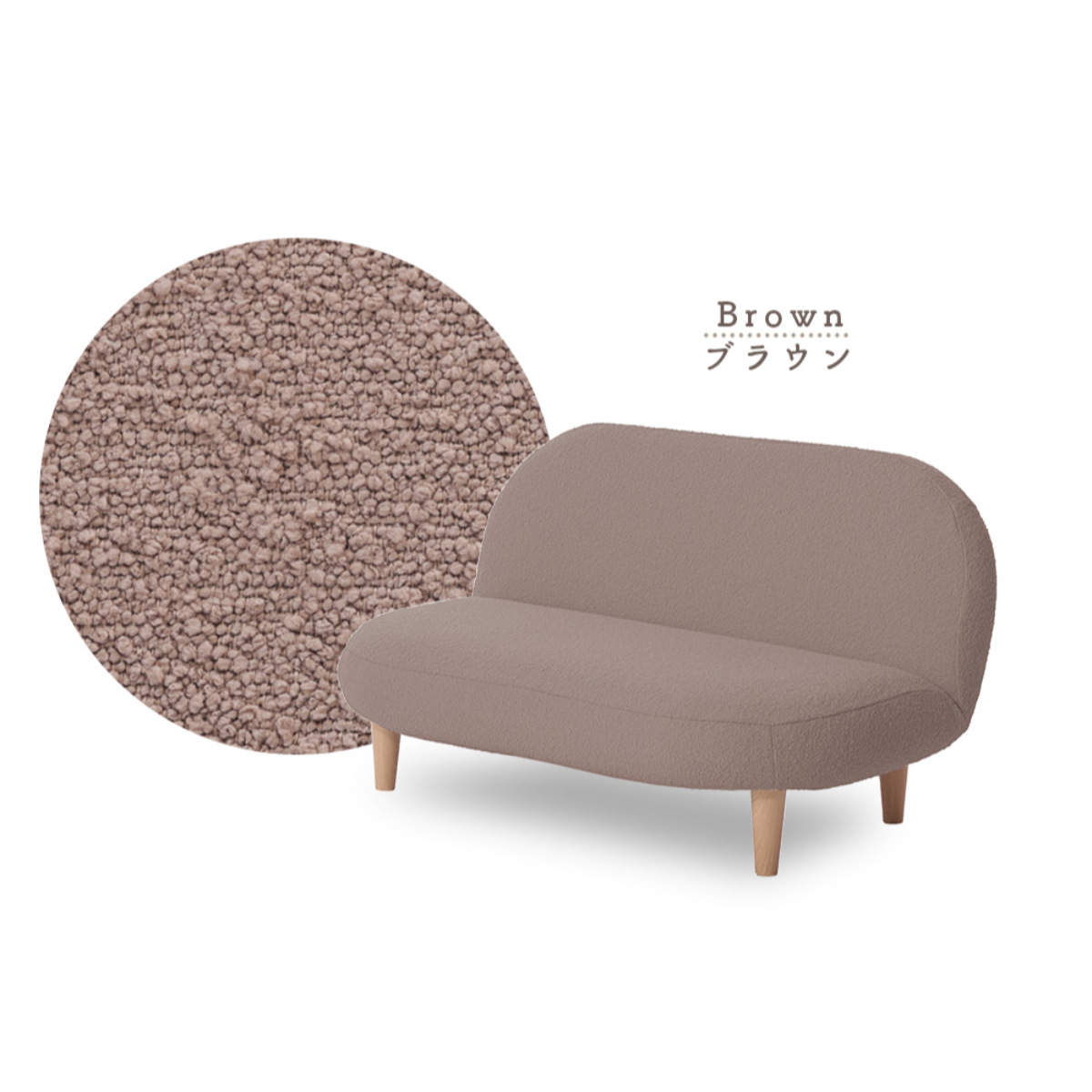 もこもことした質感の生地と落ち着いた淡い色味で、優しい雰囲気をプラスしてくれるソファです。スペースに限りがあるお部屋にもピッタリなコンパクトサイズで、置くだけでほっこりとした空間が広がります。