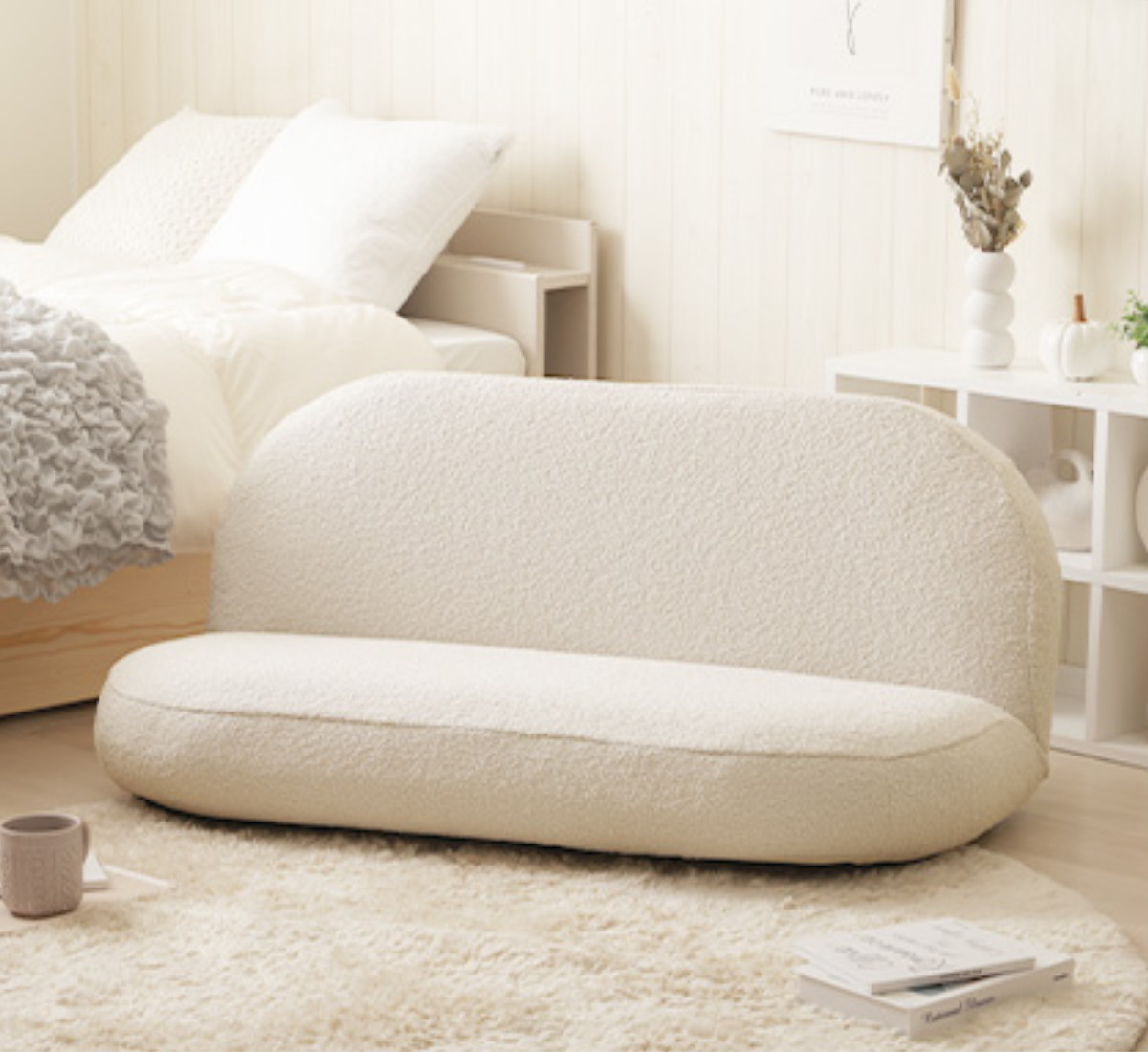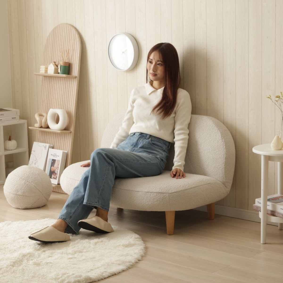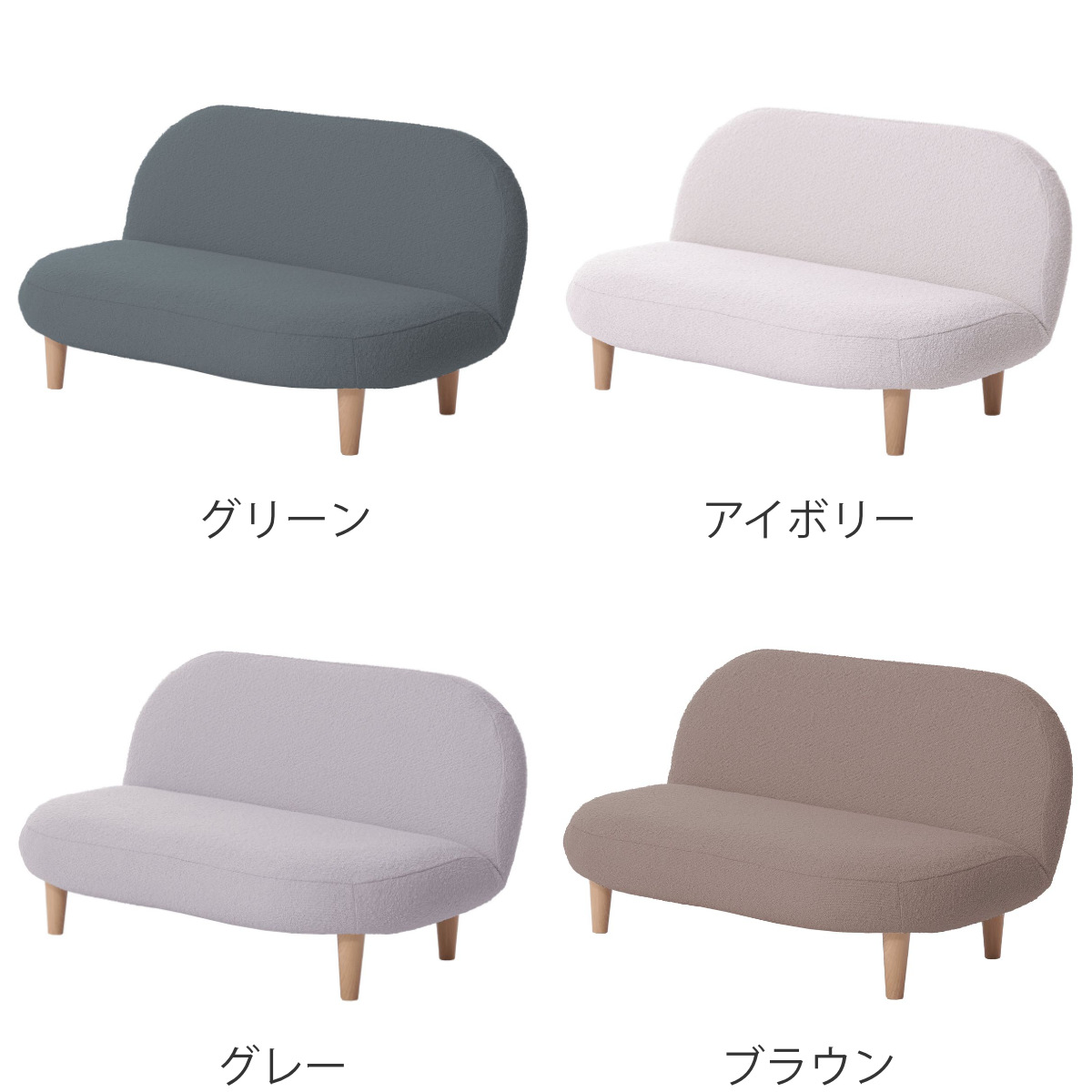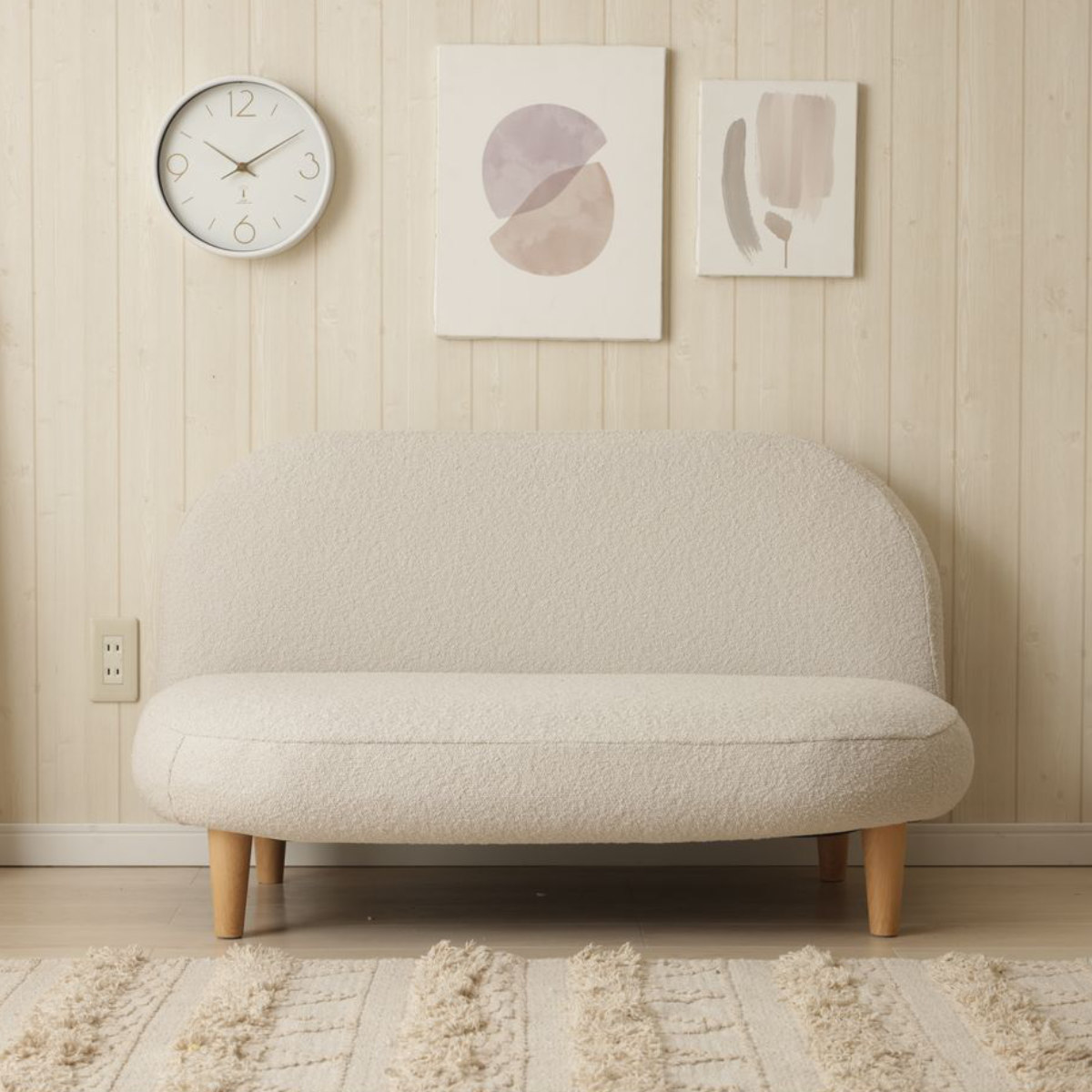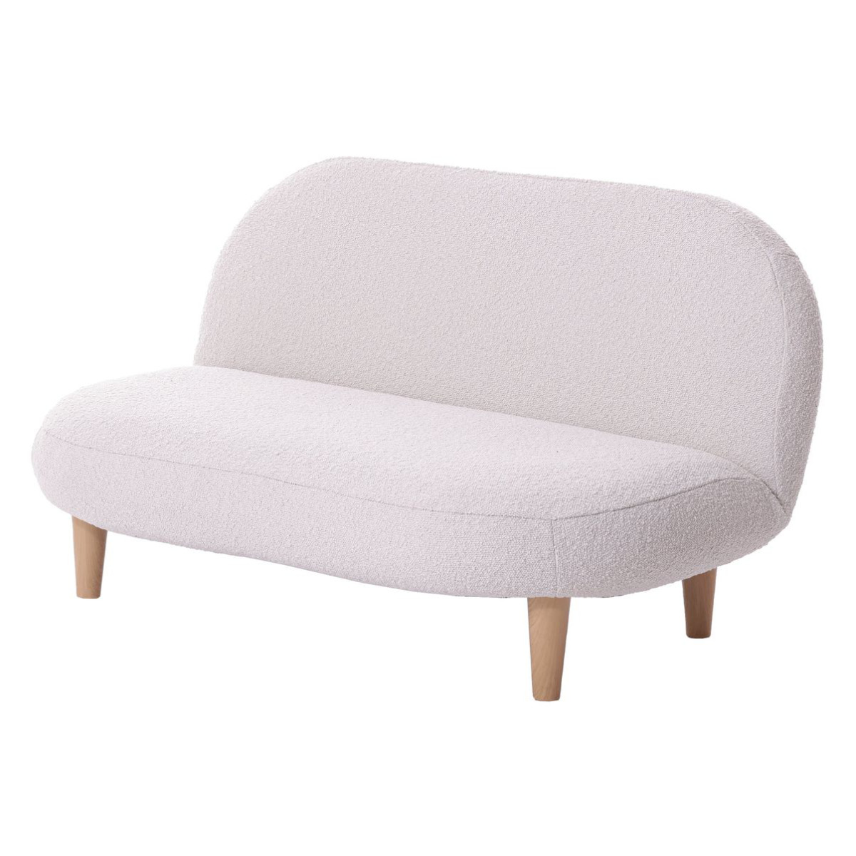 もこもことした質感の生地と落ち着いた淡い色味で、優しい雰囲気をプラスしてくれるソファです。スペースに限りがあるお部屋にもピッタリなコンパクトサイズで、置くだけでほっこりとした空間が広がります。